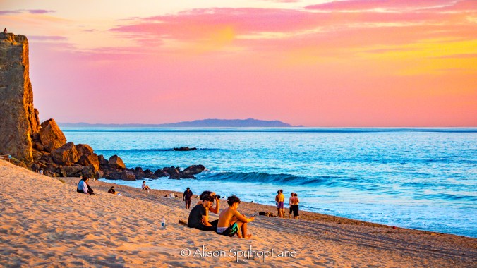 Three Gray Whales: Beach Goers enjoy Rainbow Sundog and Vibrant Sunset at Point Dume