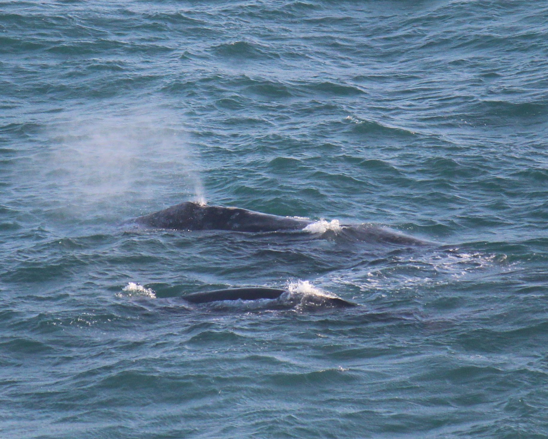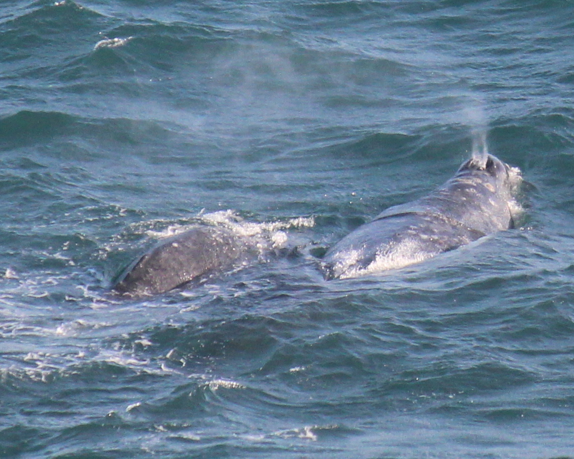 Hurray! let the gray whale cow/calf parade begin! but wait, which way are we going? It looks like the mother is heading south in this photo and the baby is going north. The pair played in this area for twenty minutes with lots of direction changes and side changes too before moving on. Here the baby is closer to the shore but in the second photo the mother is closer to the shore.