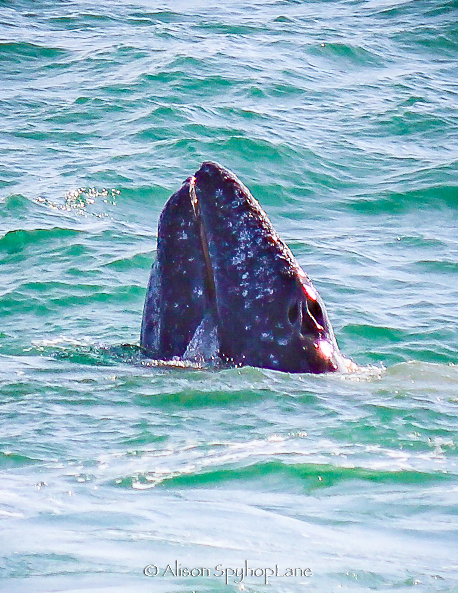 Several Gray Whales had white patches making it possible to re-identify them individually in the future. One Gray Whale Cow was underweight with visible scapula areas which are typically covered in a thick layer of blubber. One Gray Whale had heavy load of barnacles covering left side of rostrum (head) and upper dorsal back areas. The right side was clear of barnacles, exposing the dimpled indented areas where hair follicles were are at birth.