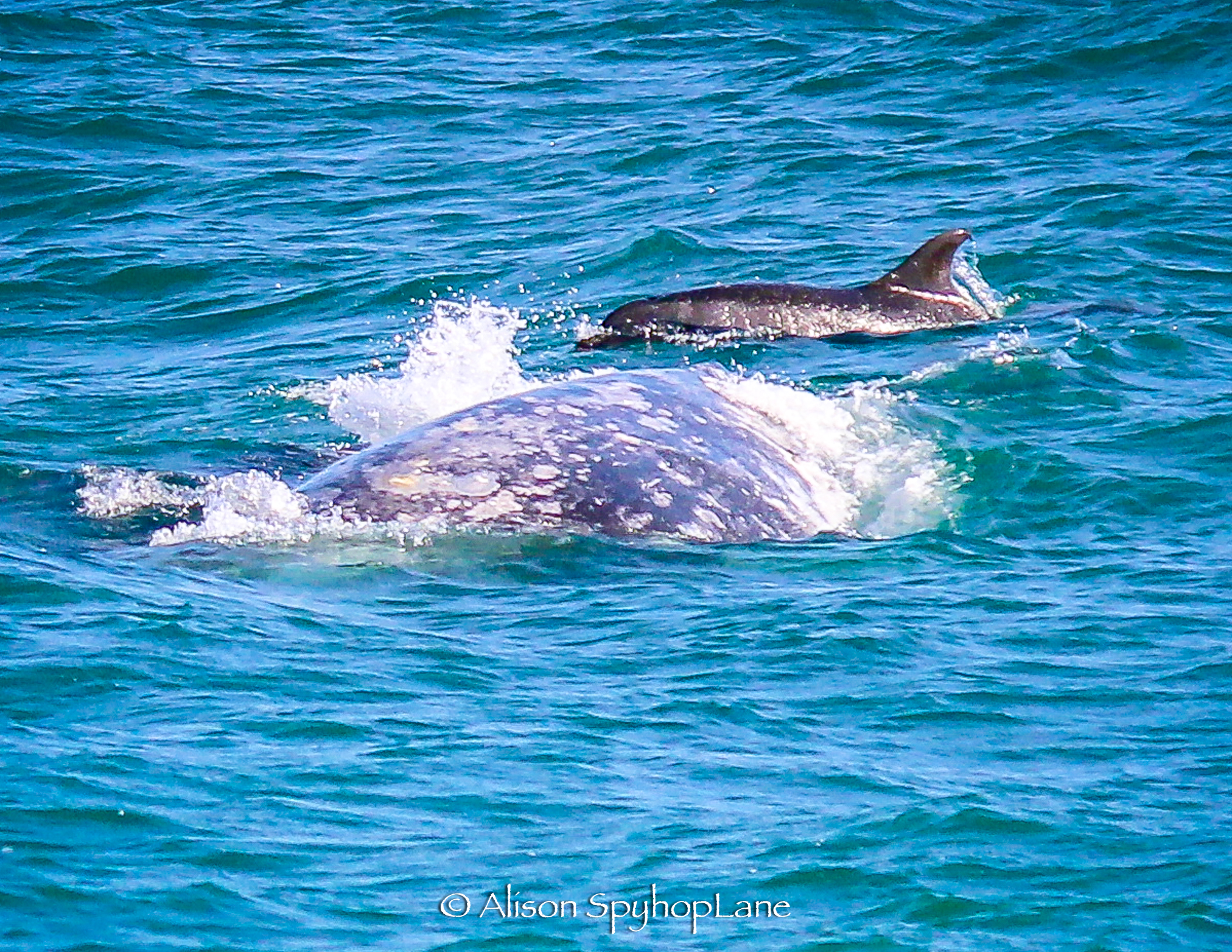 One Gray Whale’s fluke was displayed during a “sharking” behavior. This is where the tip of the fluke is visible above water , looking like the dorsal fin triangular shape of a shark. This fluke had healed older white striped scars from Orca (Killer Whale) bites. These unique scars can help with identifying this whale in future sightings. Beach goers enjoyed the whales from shore and in the rocks at the Point. Respectful surfers and or scuba divers waited and watched while the mother/calf pairs migrate through.