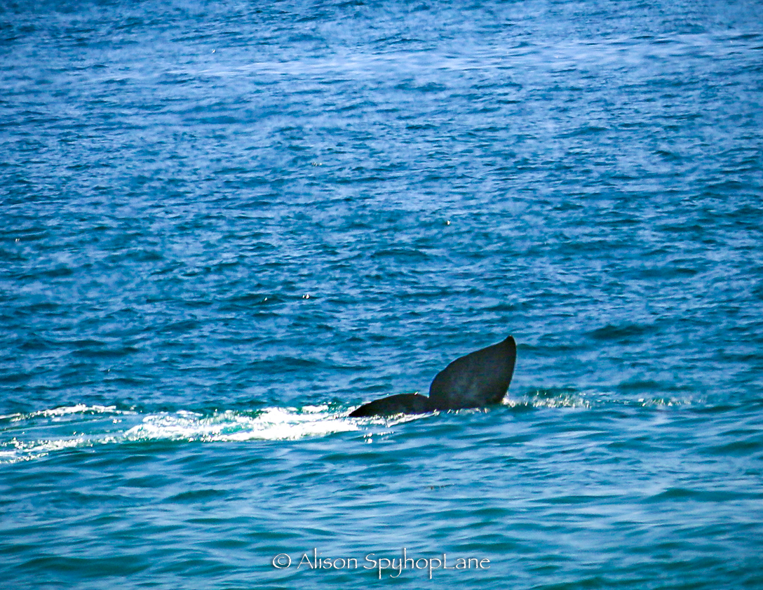Today there was only one sighting for me during the 4.25 hours I observed mid day but it was a GOOD sighting to be certain! A cow and calf pair stopped briefly to flash us their flukes in unison but it was so fast this photographer was only able to capture the calf fluke as it lingered a millisecond longer on the top of the water than its mothers. It was a beautiful sight to see bits of both flukes out of the water and see the significant difference in size in person so I will work to get a better image to share the next time this behavior occurs. The cow of the pair had two very distinctive markings on her right side. Two large white patches near the dorsal hump and one just a bit more anterior or towards the head, as can be seen in the image with the whale coming towards us. The pair didn’t linger long and traveled through quickly showing us a glimpse of the dorsal hump mark as she traveled out of sight with longer dives as they went.