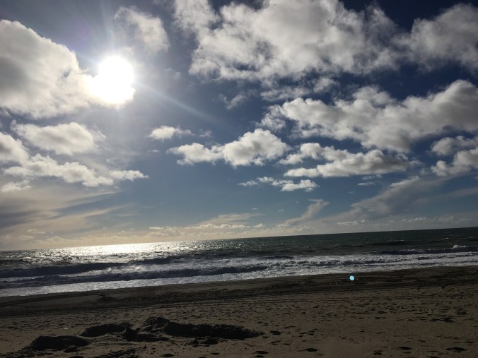 A beautiful rainbow popped up for seconds this morning in between several rounds of heavy rain. At the ocean rough waves, high winds and white caps made it difficult to spot and track the two single whales seen today. Also seen were one hawk,two slow moving cargo ships, two small groups of dolphins in the surf line one para surfer and a handful of beach walkers. The sun set with a green flash leaving glowing clouds along the horizon.
