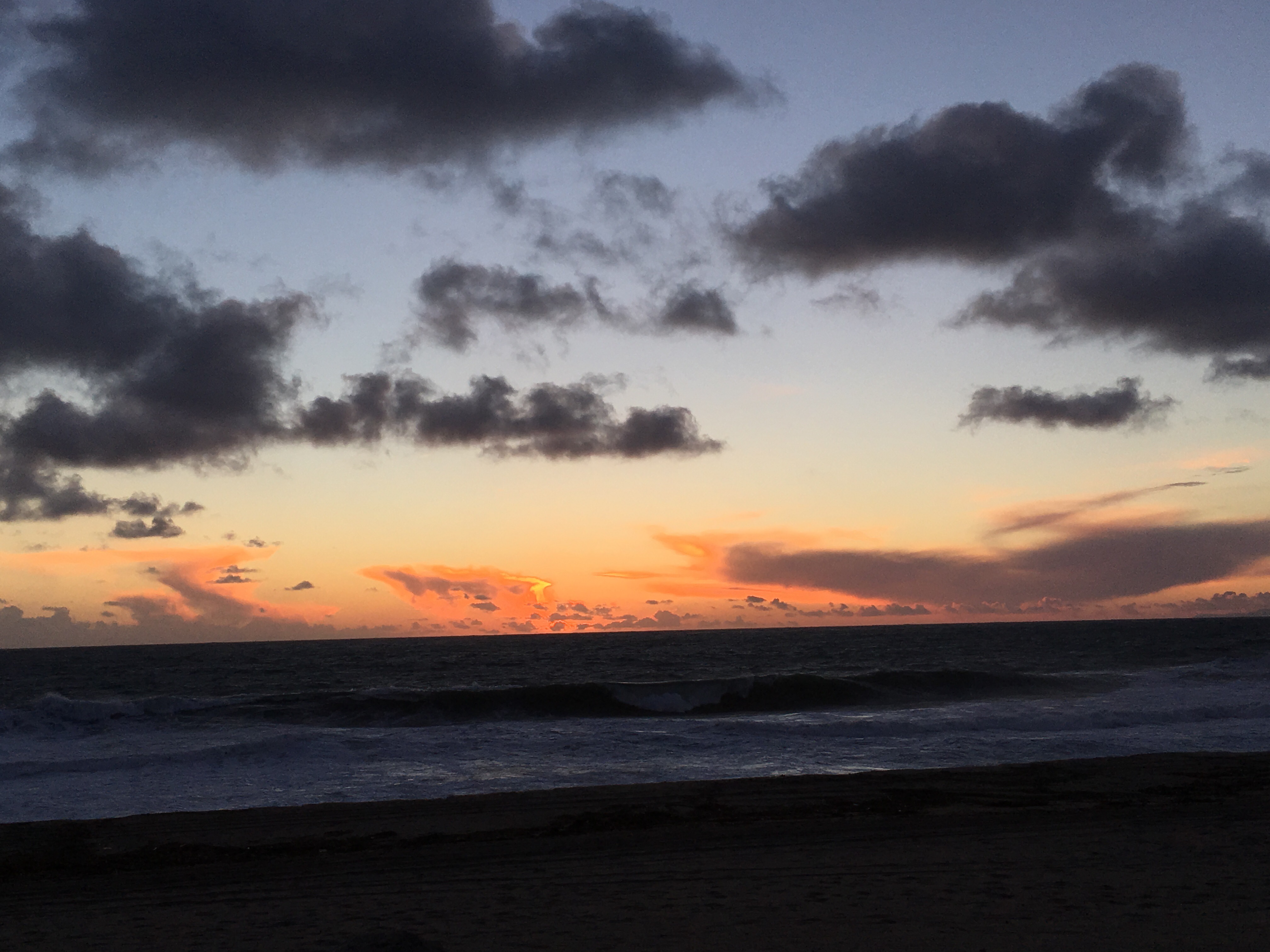 A beautiful rainbow popped up for seconds this morning in between several rounds of heavy rain. At the ocean rough waves, high winds and white caps made it difficult to spot and track the two single whales seen today. Also seen were one hawk,two slow moving cargo ships, two small groups of dolphins in the surf line one para surfer and a handful of beach walkers. The sun set with a green flash leaving glowing clouds along the horizon.