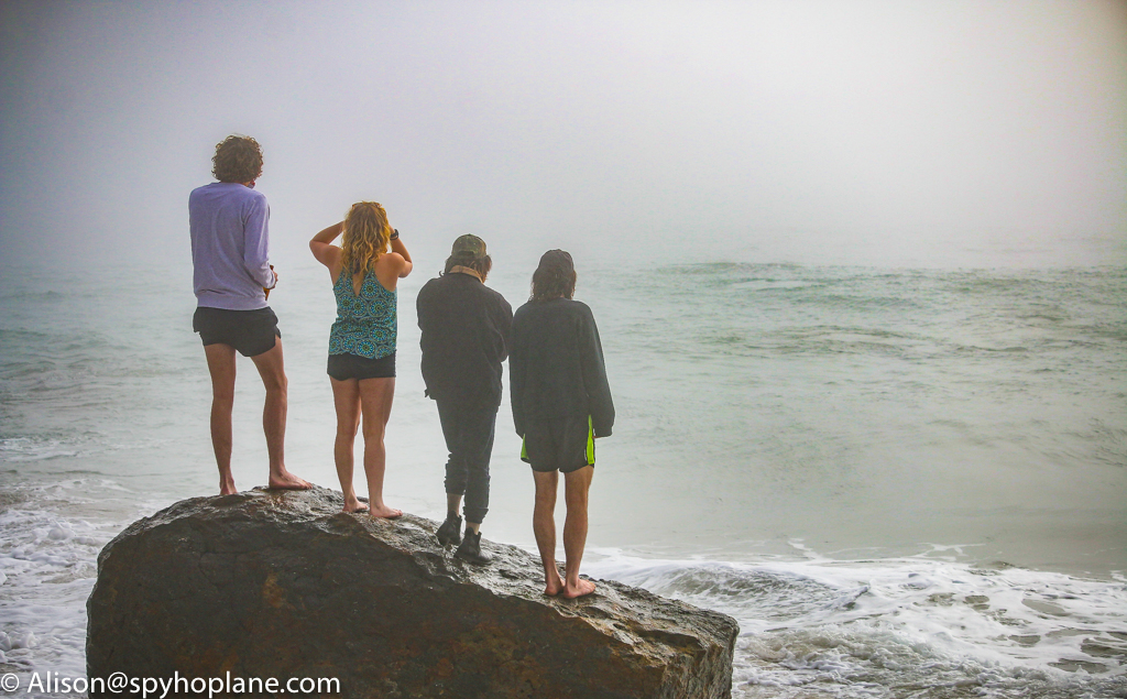 Spotting Gray Whales in heavy fog is difficult but not impossible as I learned today. In six hours I observed four migrating gray whales in three separate sightings. Listening for the audible blows in 5 % visabilty helped me identify one whale along with a very excited group of unsuspecting beach goers visiting from Echo Park.