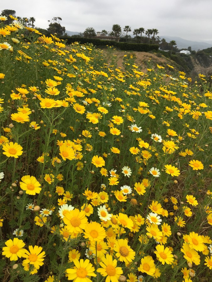 4-4-17 The Super bloom for wildflowers continues as does the northern migration of adult gray whales with one cow/calf pair, several yearling or small juveniles that traveled through slowly within 100 yards off shore. There were audible blows, spyhops , back floating, fluke splashing and pectoral fin twirling on most sightings.