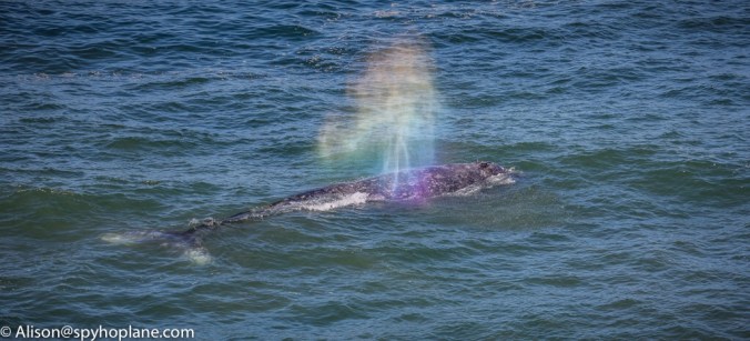 4-22-17 A beautiful rainbow heart shaped whale blow also known as a “RAINBLOW” was seen as the early morning sun was burning off the heavy low lying marine layer and lit up the whales expiration breath not once but three times as the gray whale continued on its northern migration.