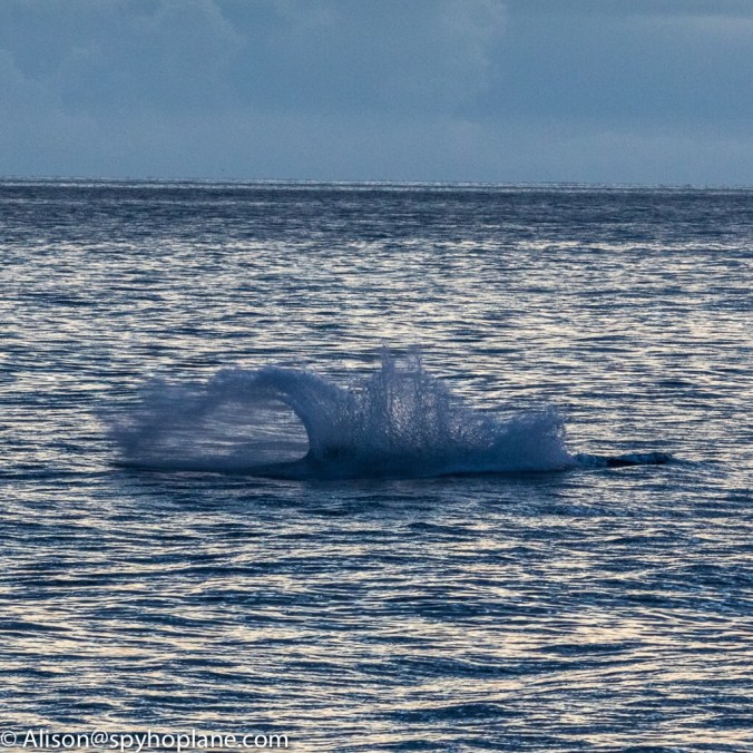 A few minutes after sunset, behind the low lying clouds on the horizon, a south bound gray whale lurched forward in a full breach not once but twice, the first observed of the 2018 “unofficial” counting season .
