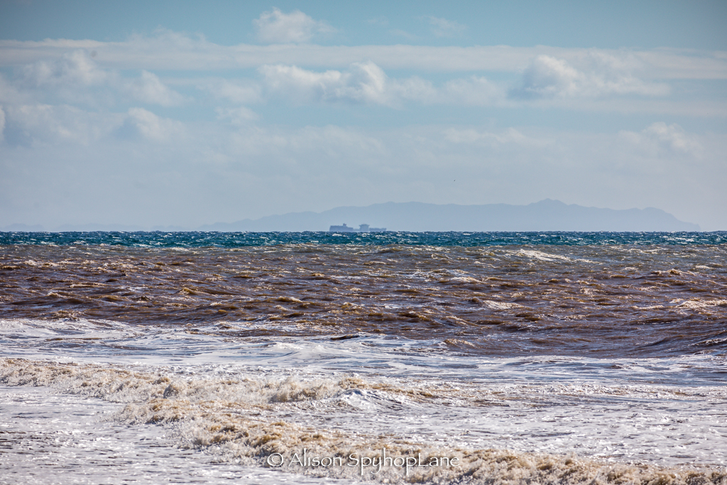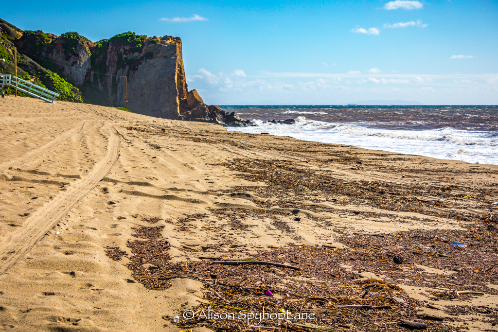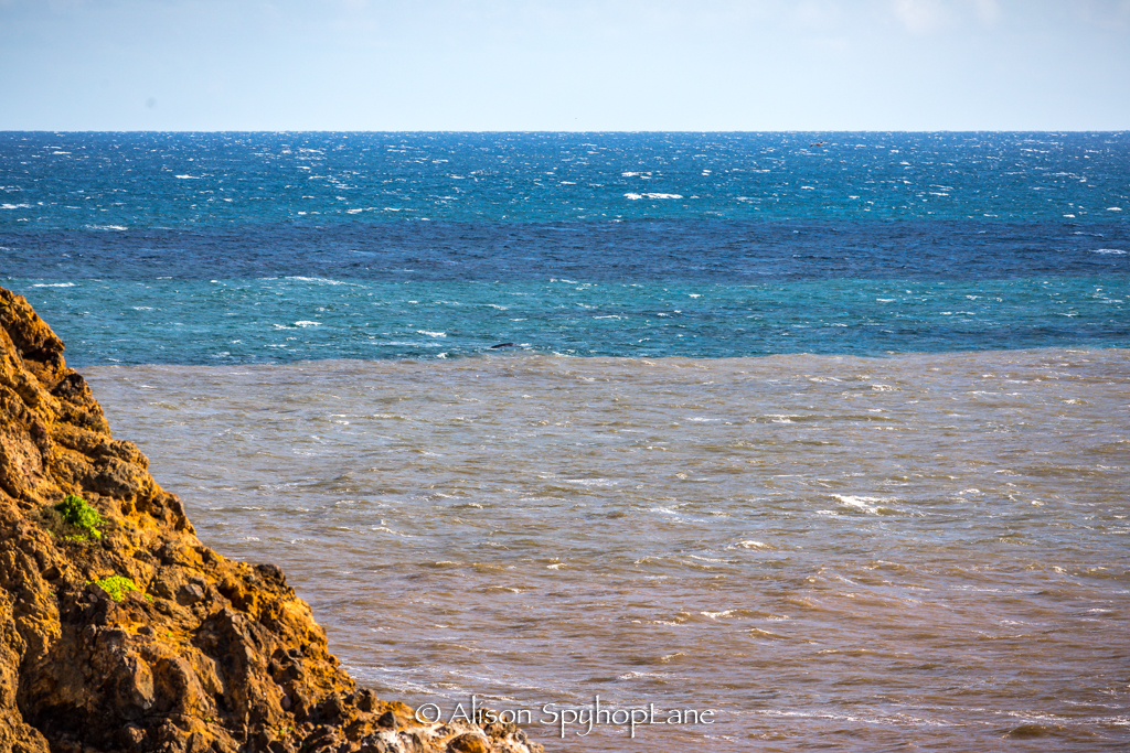 The rain came down heavy for 3.5 days causing mud slides along the Pacific Coast Highway. The rain also filled local creeks creating rivers of mud that swept debris from the Woosley fire burned hillsides. The debris flow coming from miles away ending at the ocean. The surf was muddy in areas up to 300 yards out from shore. The swash line was filled with plastic bottle caps, broken plastic toys, pipes and general trash. Erosion from the storm surge was evident at the rock climbing wall. Standard*** Rain Advisory in effect for public safety issued by the LA Department of Public Health. The whales however continue to migrate south and north despite deplorable ocean conditions. Today the whales kept to the outside of the muddiest layers as evidenced by the photos below.