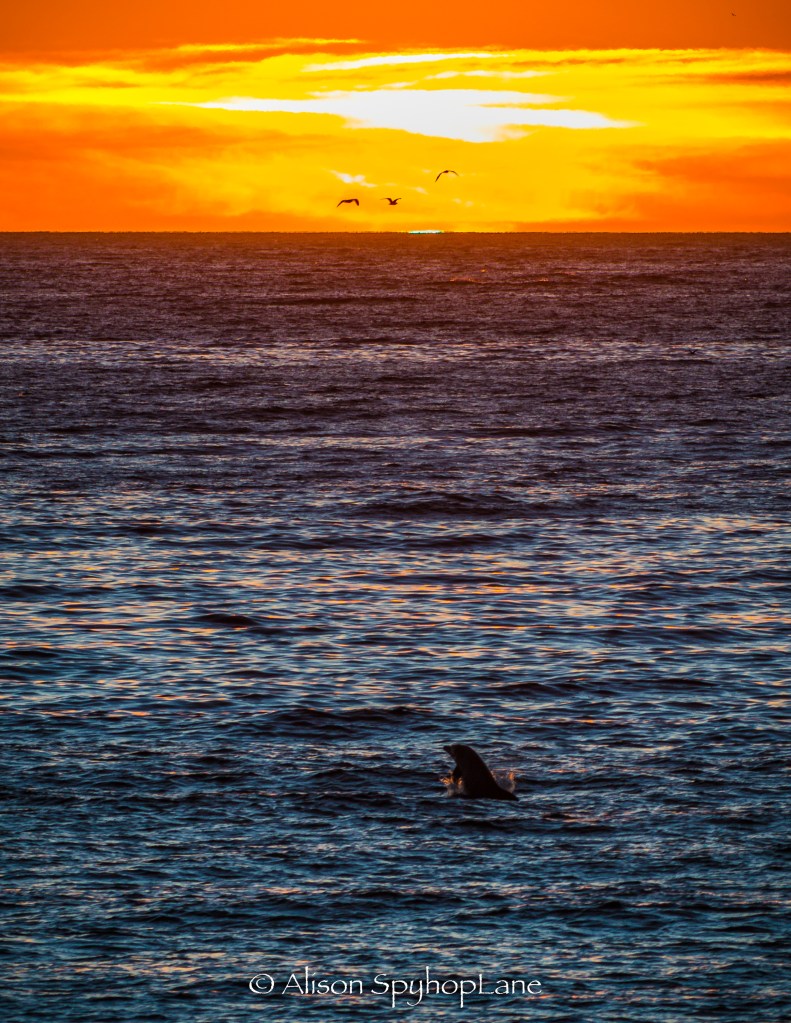 A Green flash at sunset is an optical phenomenon caused by the bending rays of color like a prism, as the sun dips below the horizon. The last tip of the sun elicits the rare green flash thats visible for only a split second or two at most. The right timing and conditions are needed for it to be seen and even harder is to capture on camera. Tonight it all came together with the dolphins leaping at just the right moment and the seagulls add an extra dimension making for one spectacular sunset.