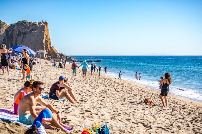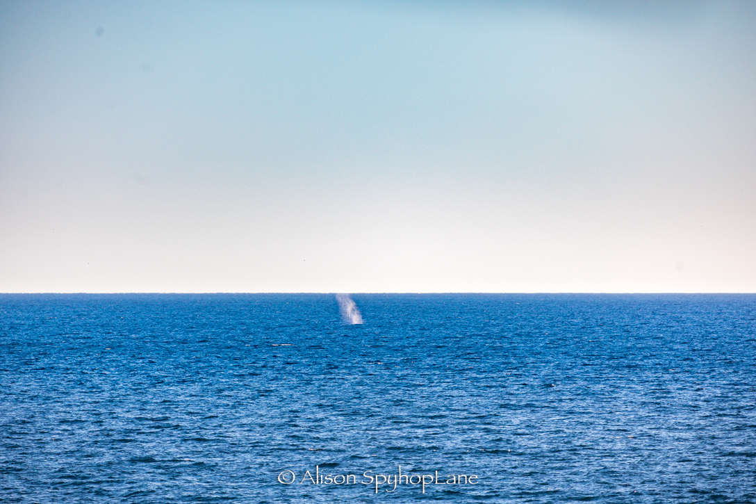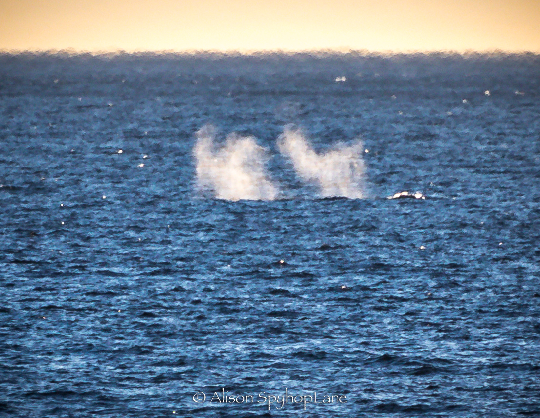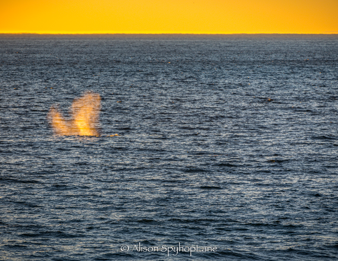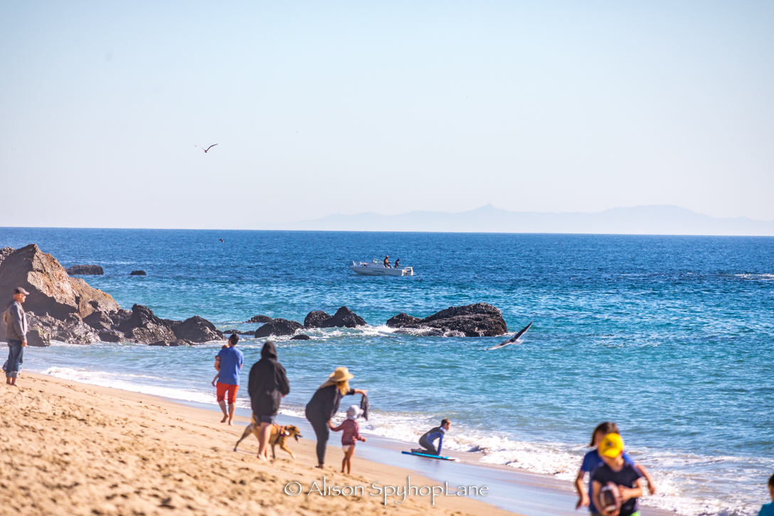 It was a crowded beach with lots of swimmers and sun bathers watching as eight plus whales migrated past on this warm 68 degree winter day. The calm water had with a lake like shore break, sparkling all the way to the horizon. A pair of kayakers stayed in Pirates Cove doing what seemed like laps around the cove and a fishing boat stopped with two fisherman to fish before the Baywatch Malibu boat came with lights on to direct them on their way. It was so calm and clear that a single large blow and long dark back seen at the north (west)end of Catalina Island. Too far away (even with binoculars) to differentiate which species of whale but so great to see at all. Two sightings had dolphin escorts- one was north bound and the other was south bound later in the day. The south bound whale came just before sunset which created a golden pink hue glow to the blow, delighting those who caught the split second sight. Sunset had a split second sliver of a green flash as it set below the horizon.