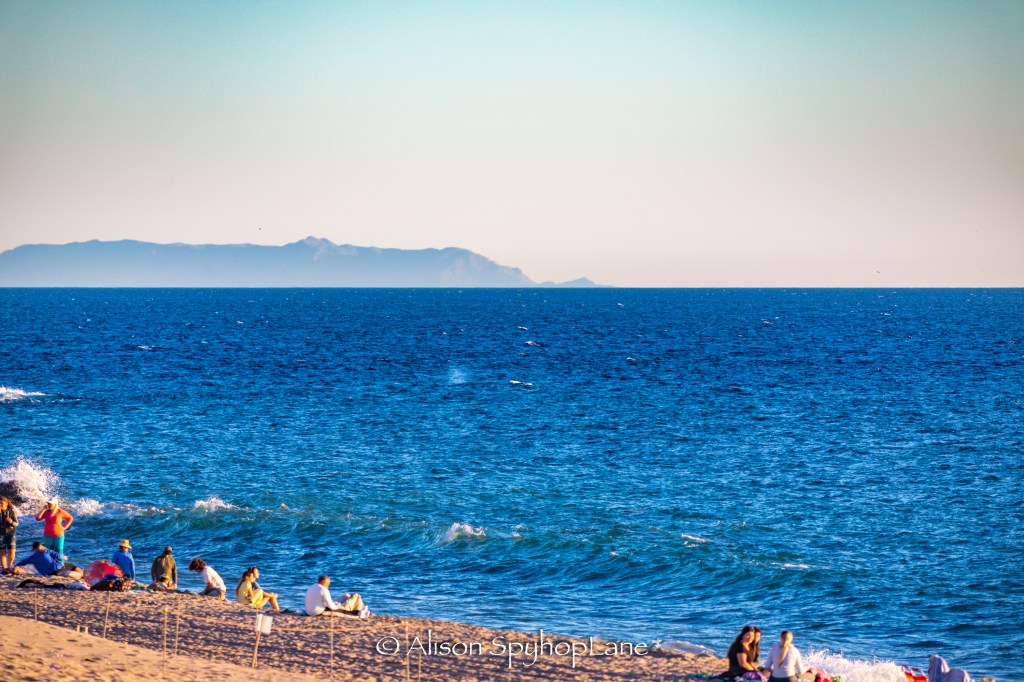 One north bound gray whale sighting on a beautiful, clear and calm unseasonably warm, 78 degree spring like winter day. Small pod of 5-7 active Dolphins including an interactive mom and calf traveling with 2-3 escort dolphins at all times. Behaviors included, tail lobbing, foraging, with bursts of stampeding back and forth in all directions. Lots of visible blows and splashing. The Goodyear blimp made a short flyover along the coast before heading back over land.