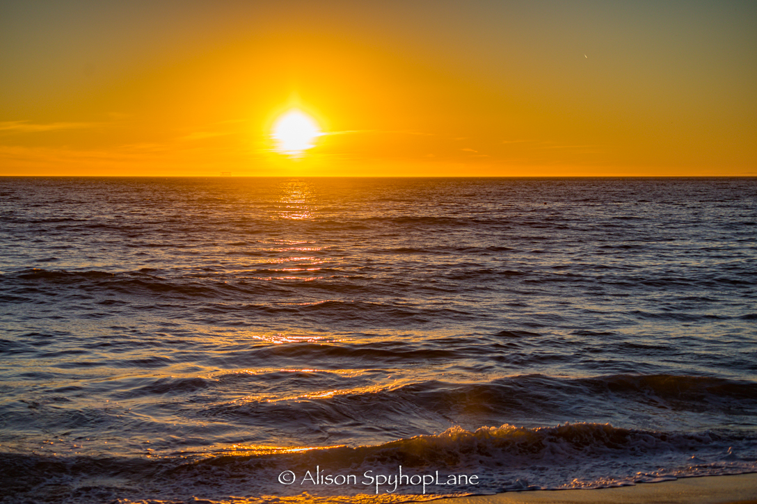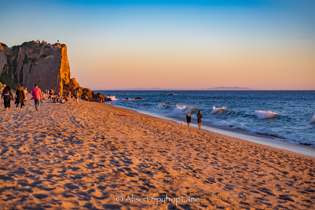 Another warm day of Santa Ana winds, with a choppy ocean, and white caps near horizon. Lots of people on the beach walking and enjoying the warm 80 degree summery mid winter day, tourists seen swimming in brisk chilly 56-57 degree water. Local surfers in full wet suits try to catch a wave with high tide coming in an hour after sunset. The golden hour before sunset and the blue hour just after are often the best times to see a migrating whale from shore, due to the way the low sun rays refracts through the water droplets in the whales expiration known as a whale blow. If the conditions are just right the blows glow pink or golden orange. Tonight was not one of those nights. No whales and no blows to be seen. Good news is there’s a new chance to look again tomorrow.