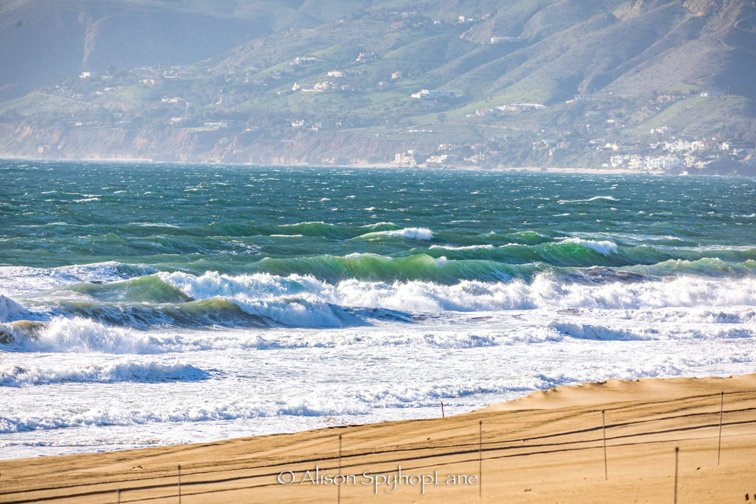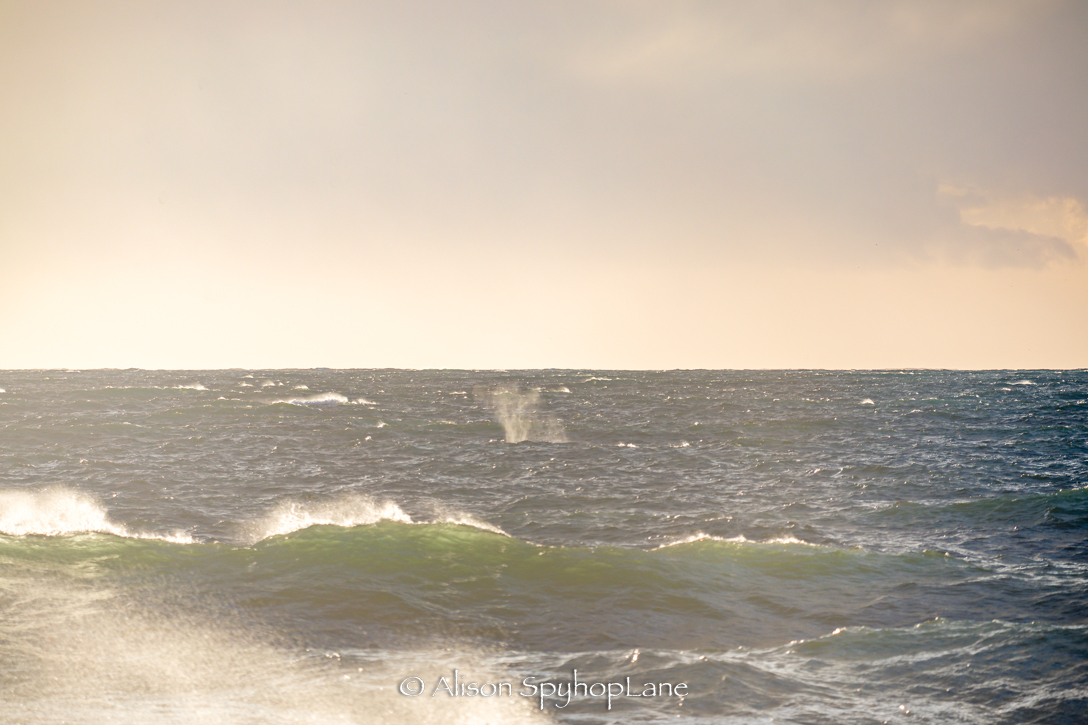 Gusty 25+MPH winds on this chilly 62 degree sunny day. Large white caps from shore to the horizon making it difficult to spot and track the gray whales. Sand blowing and accumulating in the parking lots like snow in a storm. Still the whales migrated and were seen in 6 sightings.