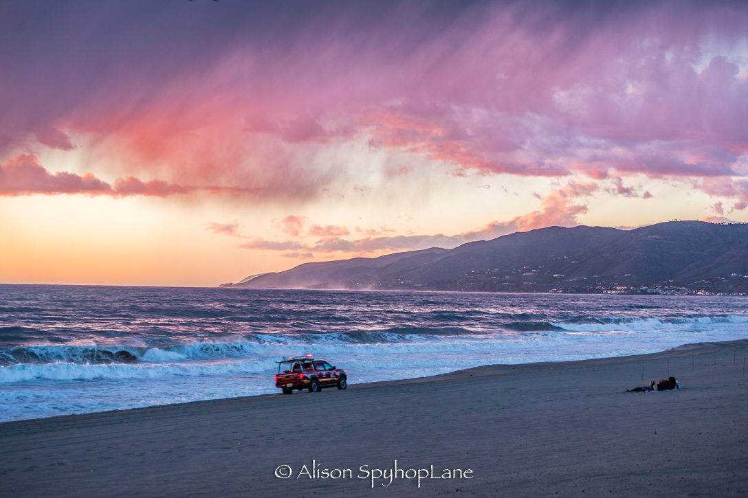 The wind died down to 1-3 mph before sunset as a huge set of dark clouds rolled in from north west over the Santa Monica Mountains heading south. Rain spouts were seen at the horizon, over the Channel Islands and over the Leo Carillo State Park as the storm moved through eventually hitting Point Dume well after sunset with drizzle.