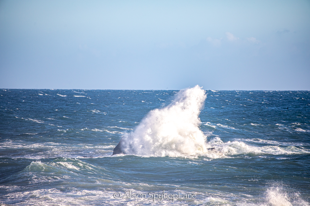 A fast moving trio turned into a pod of 5 whales, as a pair snuck in and caught up. Dorsal humps and heads poking out between the waves. A pair of military helicopters helped to spot a single whale as the helicopters circled back a few times to take a look from over head. One large adult was traveling with a smaller juvenile or yearling with pointy, deeply notched knuckles poking out from the rough surf, most likely underweight. The pair made their way around Pirates Cove zig zagging in the rough surf for 30 minutes.