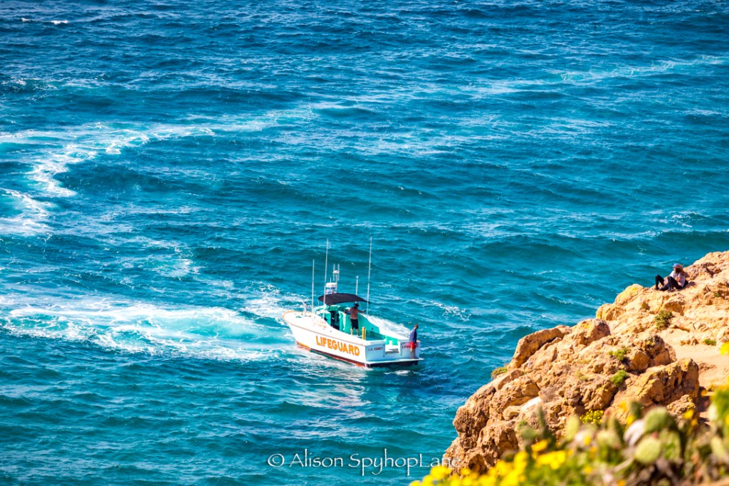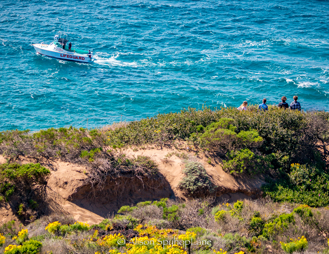 Baywatch Malibu and Lifeguard Specialists are extremely careful to protect the wildlife, training skills are practiced in rough ocean conditions thorough out the year. Today they picked up a lifeguard from Tower One who paddled out to the boat using his arms on the Lifeguards surf board. Meanwhile the first gray whale was sighted just under the bluff traveling close to shore, hugging the north side of Big Dume Cove. Sadly this was an emaciated sub adult whale. Thankfully, as expected, Baywatch Malibu, is aware of the gray whales migration path and went slowly, as this whale glided past, just under the surface not even coming up for air and turned out to deeper water after passing the boat.