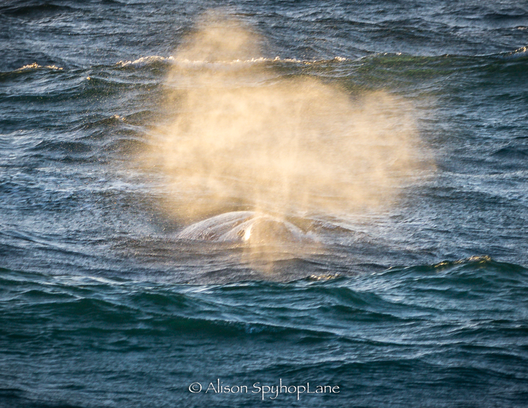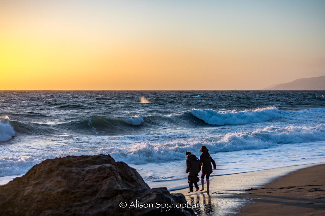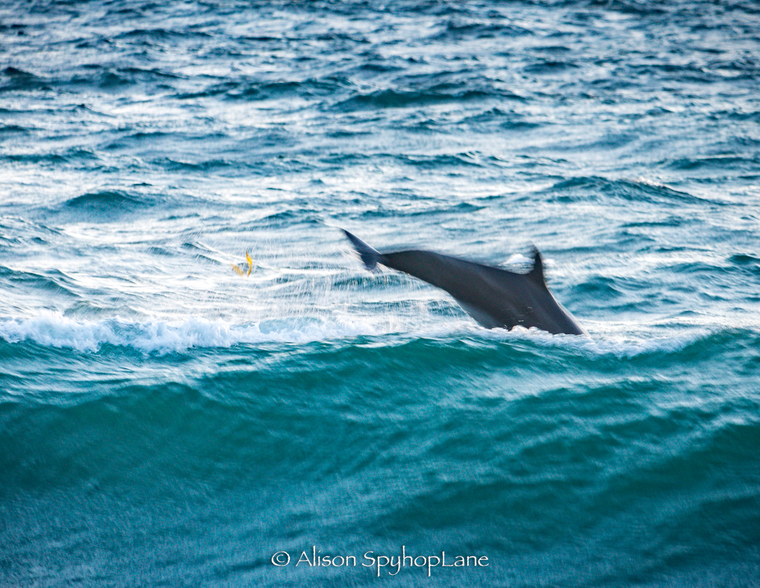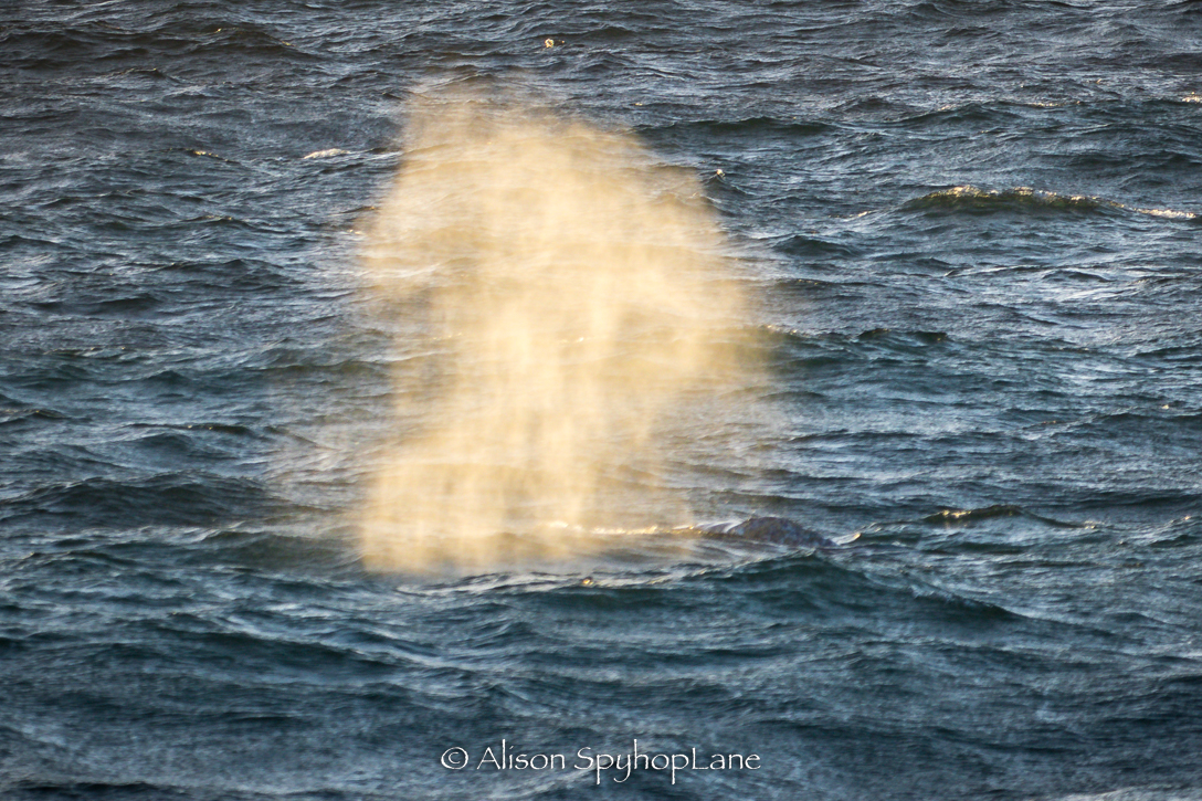 Cold and brisk, 58 degrees with 20+mph winds. Rough choppy surf. A trio of gray whales split up into a pair as a solo gray whale traveled through, out to deeper water passing the point. The pair came in to the point displaying several low key whale behaviors which included several bubble blasts and footprints with a tiny mix of sharking and rolling. Several directions changing directions in the cove until finally one left and headed out to deeper water and the last one stayed close to shore, traveling just outside the surf line until Tower 2 and went out on its way north. One whale was thin with double dips at cervical (neck) area, seen as it was leaving in the photos below, its body had interesting contours. A dolphin popped up in the surf as the last whale was heading out and porpoised in the surf just once! The setting sun caused the sky to turn a shade of lavender and ended looking like pink and orange sherbet as it dipped below the hazy cloudy horizon.