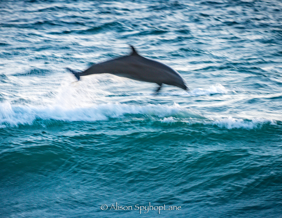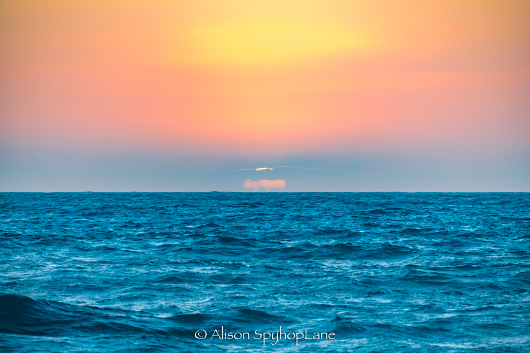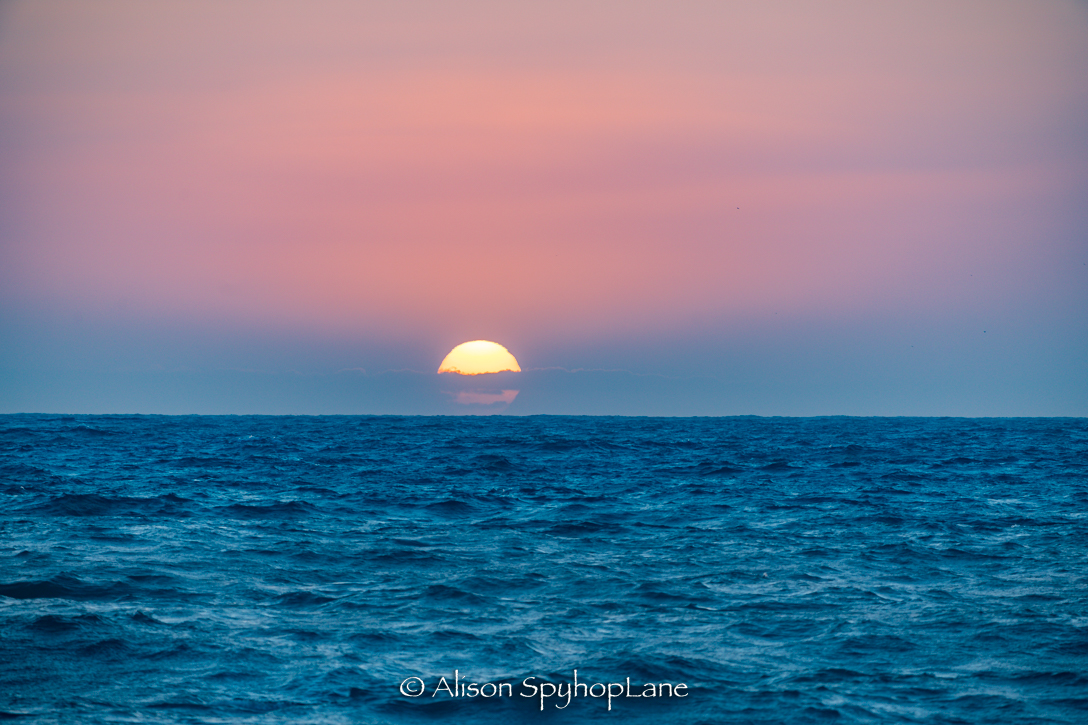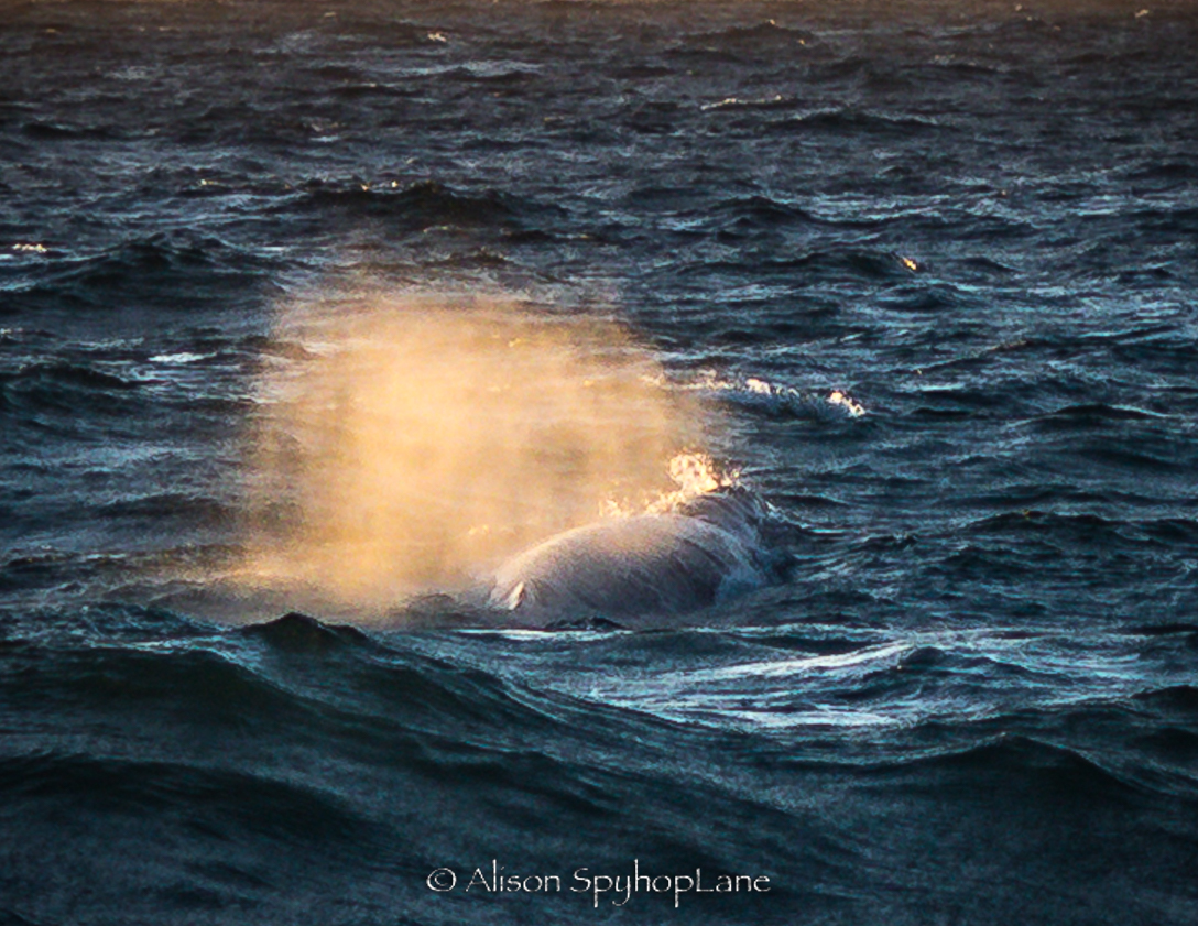 Cold and brisk, 58 degrees with 20+mph winds. Rough choppy surf. A trio of gray whales split up into a pair as a solo gray whale traveled through, out to deeper water passing the point. The pair came in to the point displaying several low key whale behaviors which included several bubble blasts and footprints with a tiny mix of sharking and rolling. Several directions changing directions in the cove until finally one left and headed out to deeper water and the last one stayed close to shore, traveling just outside the surf line until Tower 2 and went out on its way north. One whale was thin with double dips at cervical (neck) area, seen as it was leaving in the photos below, its body had interesting contours. A dolphin popped up in the surf as the last whale was heading out and porpoised in the surf just once! The setting sun caused the sky to turn a shade of lavender and ended looking like pink and orange sherbet as it dipped below the hazy cloudy horizon.