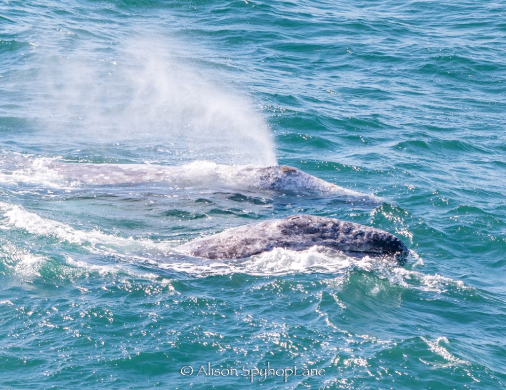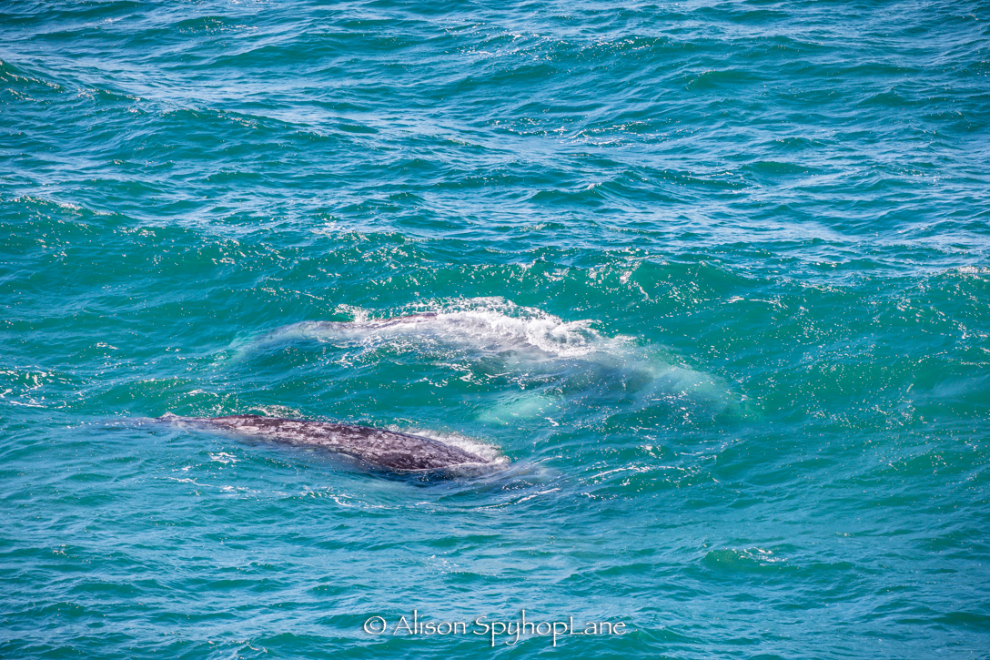 Two gray whales, migrating side by side, with close up views of their rostrum (upper jaws ). Could this pair be an adult female whale with its yearling or juvenile? The smaller of the pair has visible dimpled depressions for stiff whisker like hairs called vibrassae, but none can be distinguished in these photos. The larger adult whale, has more areas of paleness or whiter areas caused when barnacles fall off, leaving white scars. As the whales age these scars accumulate and some whales end up looking very pale and glow under water with lack of pigment.