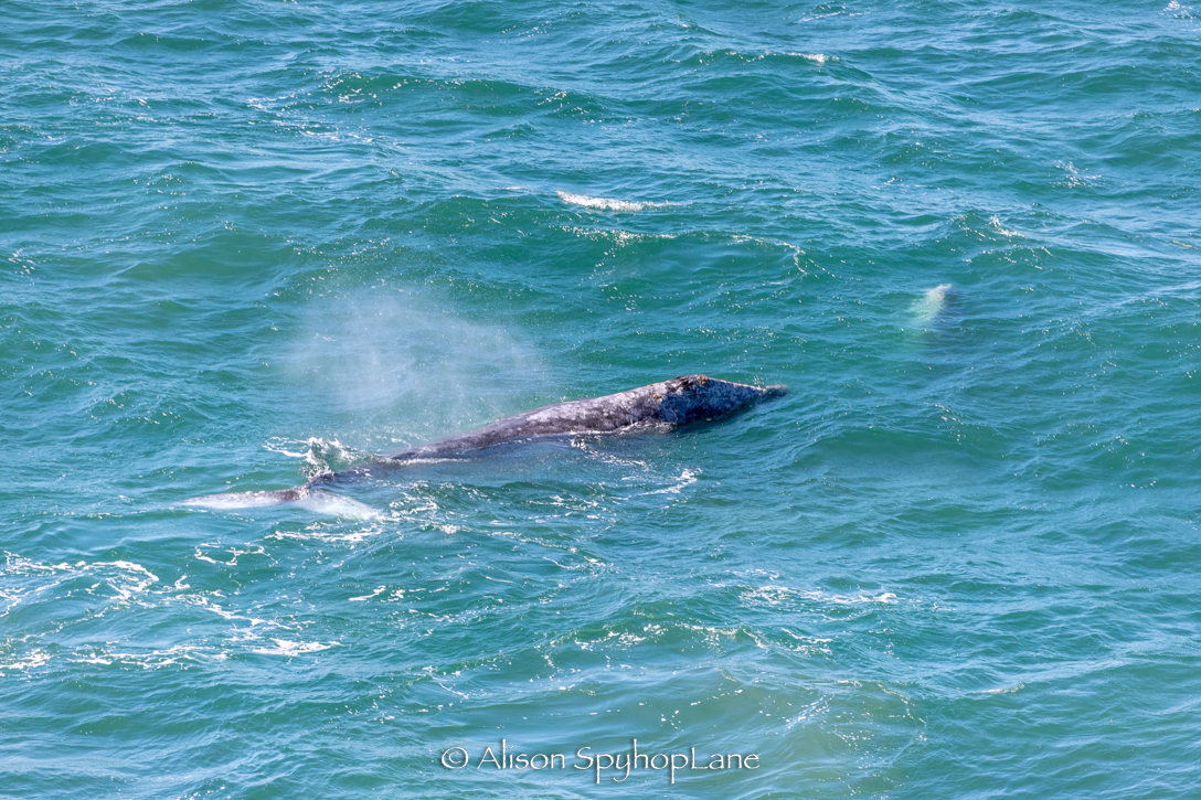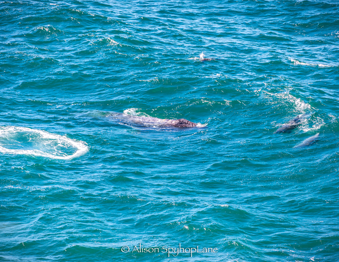 A group of eight whales gathered in Pirates Cove, arriving and departing in pairs, until a quad was left and then the four moved on together. Lots of active behaviors including: head lifts, spyhops, tandem spyhops, rolling, back floating, playfully gliding over and under in and out of the surf. There was also several dolphin and sea lion interactions separately and together. The sustained winds and rough ocean with large white caps to the horizon and strong wind made it challenging to track the whales as they moved further north (west) along the transect today.