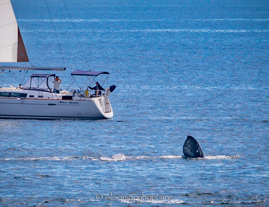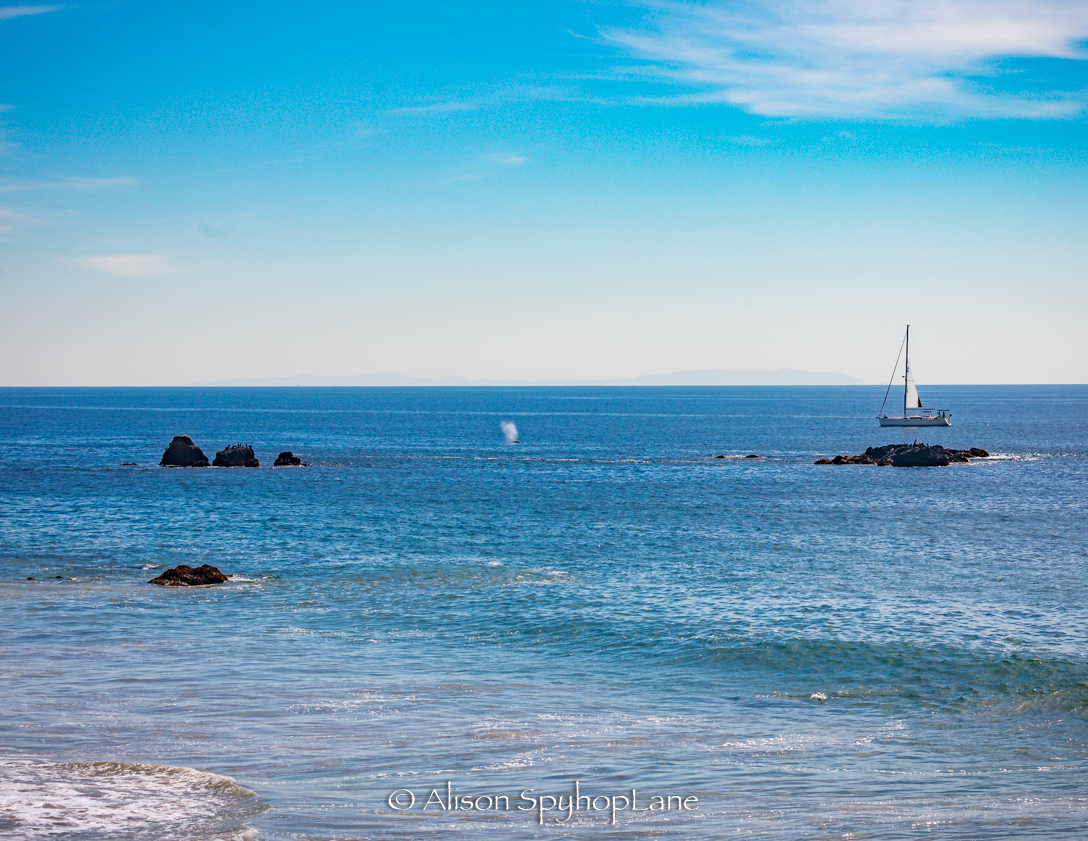 A trio of thin whales were milling south side of Bird Rock when a sailboat traveling south spotted them and turned back to observe (thankfully)from a safe responsible distance and the whales continued to mill.