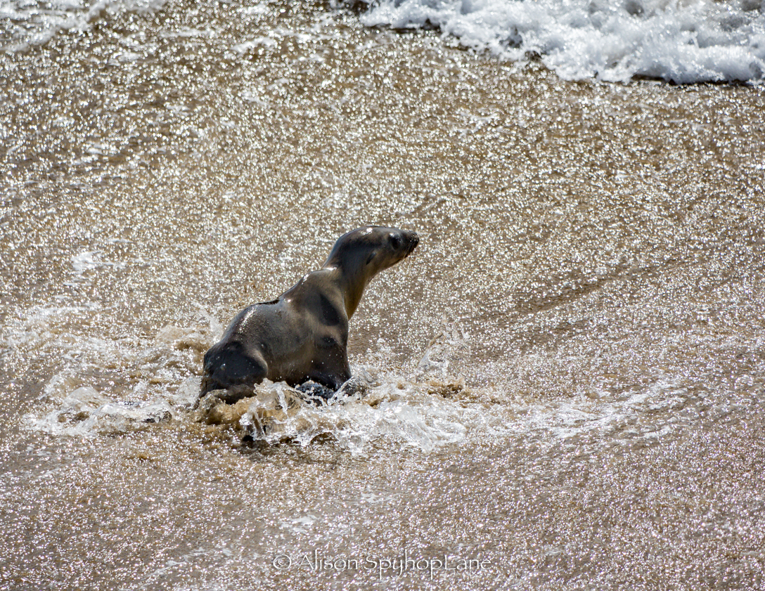 A small emaciated (severely underweight) sea lion attempting to haul out as this beach goer patiently waited until it made it up onto land.