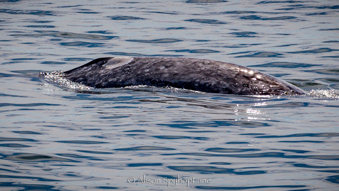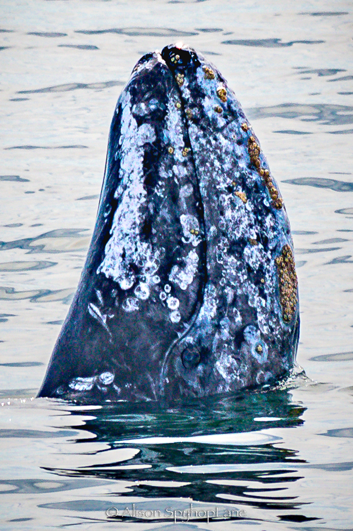 Eyes above water for this spyhopping gray whale. The partly cloudy sky effected the lighting and offered different perspectives, catching some interesting contours of this underweight whales head as it went back into the water.