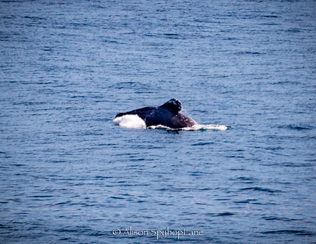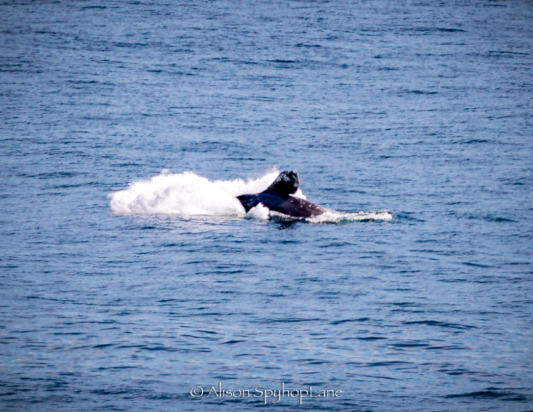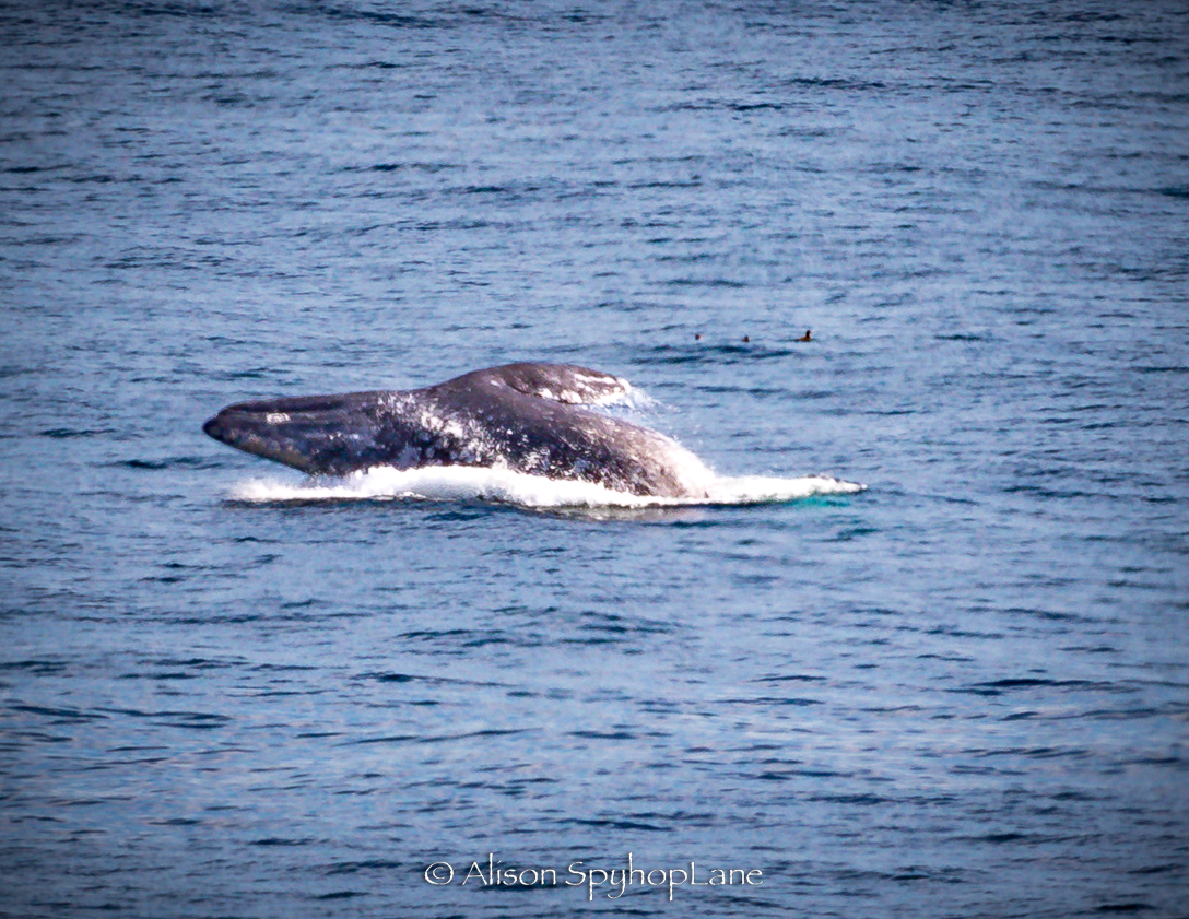 Breaching whale seen above! The whole sequence takes place in less than one second! Thankfully this whale breached three times allowing a second and third chance to capture the spectacular feat. It takes an enormous amount of energy 28 km/h or just over 17mph to burst up out of the water- the last photo in this gallery above is actually just before the breach started…a light blue ring of water seen with bubble blasts or under water exhales but this whale breached up and out with water spewing from the mouth not a typical breach behavior seen. Water spewing from the mouth is seen when gray whales are feeding. Gray whales are also opportunistic feeders and while they don’t usually eat on the migration path they do display feeding behaviors along our transect. This is the first captured breach with theses details. Below is the second breach that was ventral (belly) side to the camera. No water spewing from the mouth.