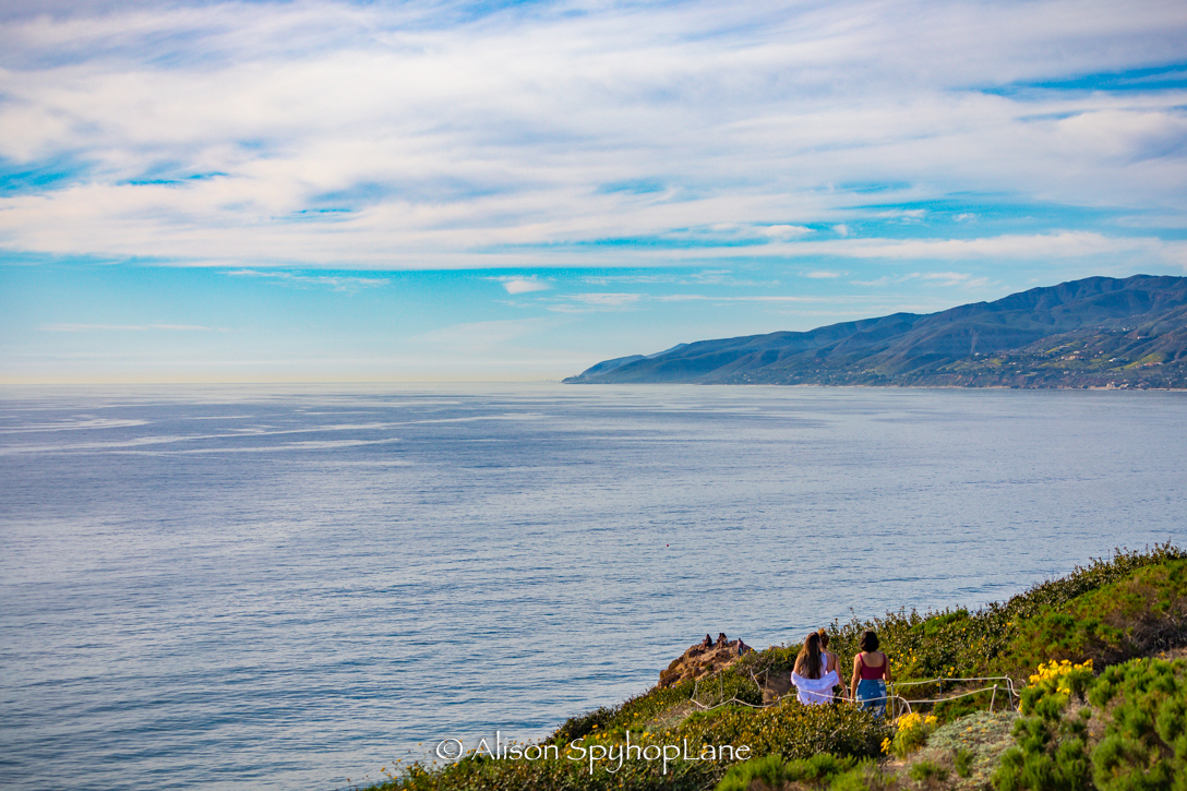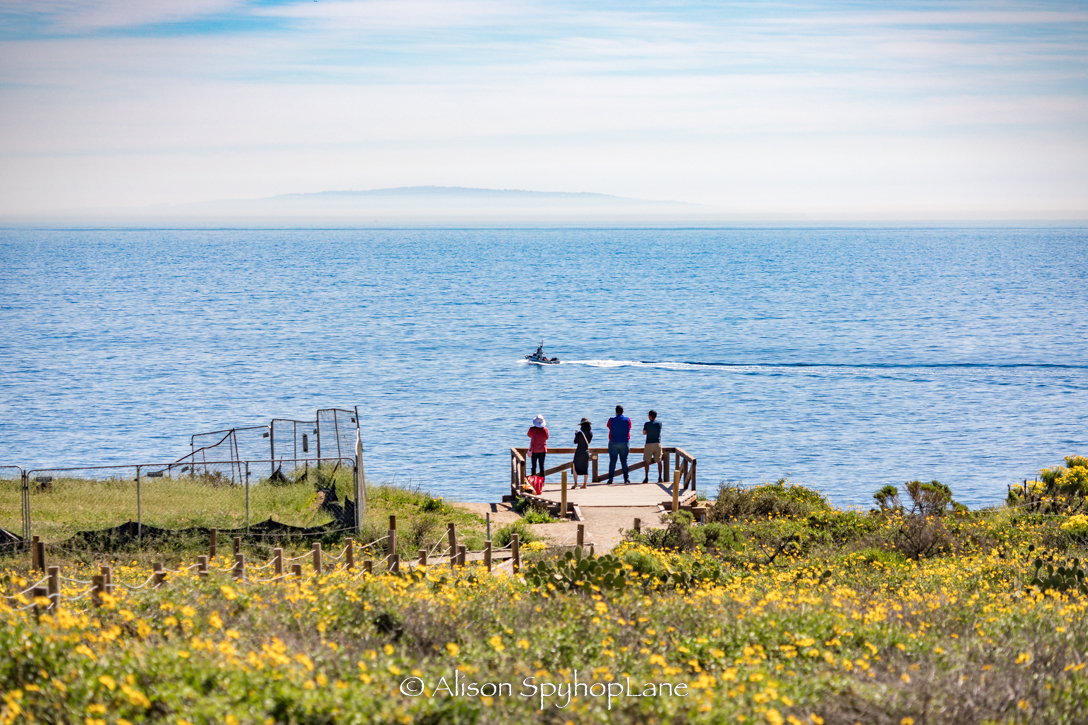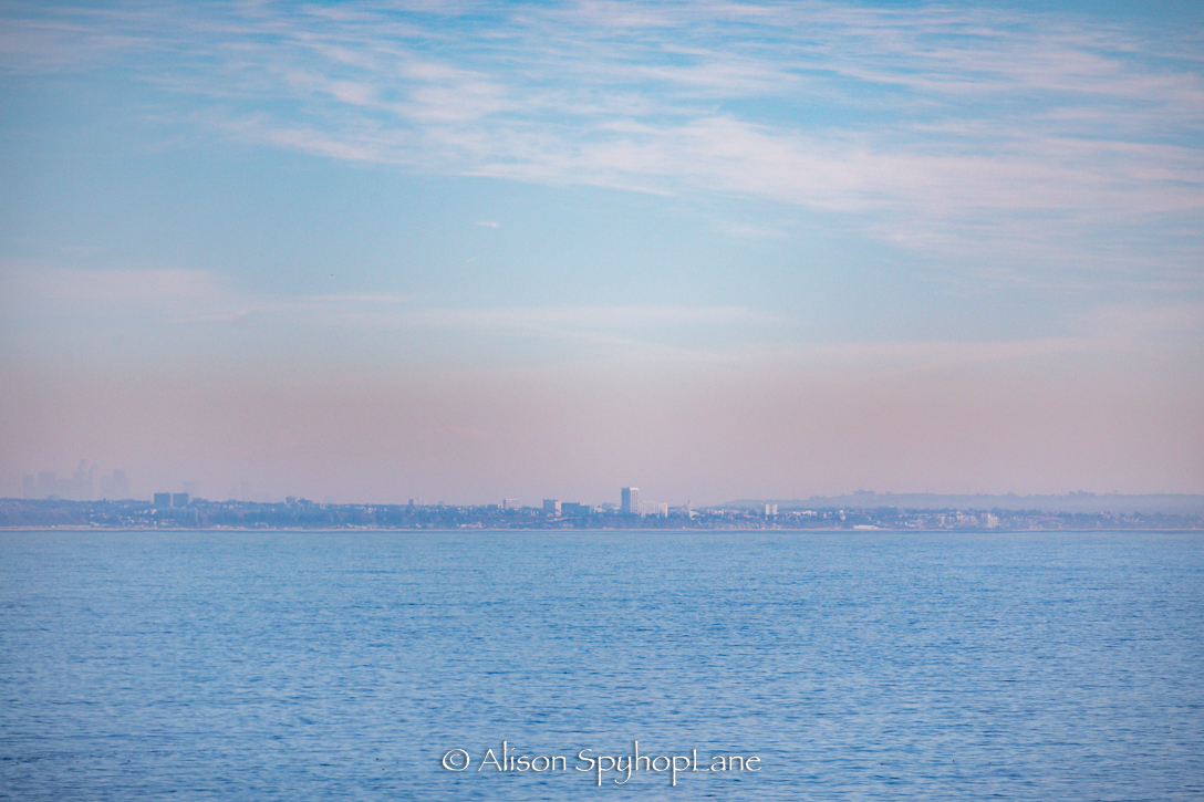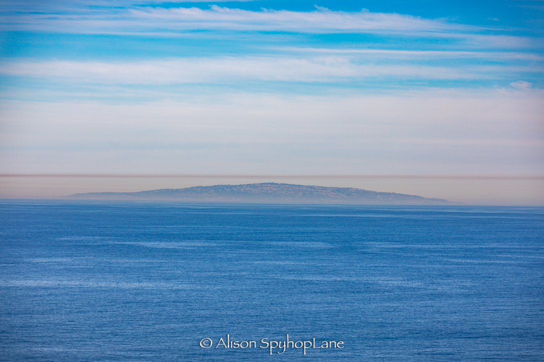 Hazy shades of pink and yellow from smog and marine layer today, seen across the Santa Monica Bay to Port Hueneme. The ocean was flat and calm with 1-3 mph wind. A visiting group of whale census counters from the American Cetacean Society- Los Angeles (ACS-LA) were out this morning on a photography walk to look for whales and counted an additional 7 whales in 3.75 hrs and spotted a golden eagle! A rare sighting in this park! ****see note at end of post****