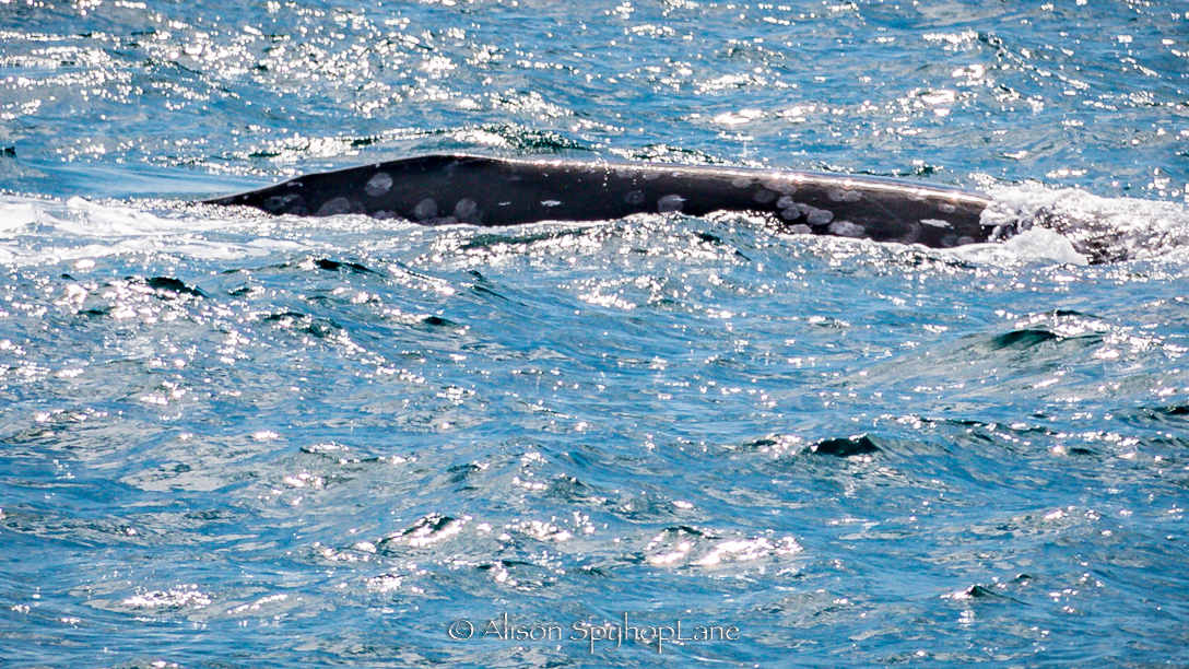 Sunny skies overhead with banks of clouds at horizon in all direction. Fast moving storm clouds brought drizzly rain drops. Fast moving whales in 17 sightings today!