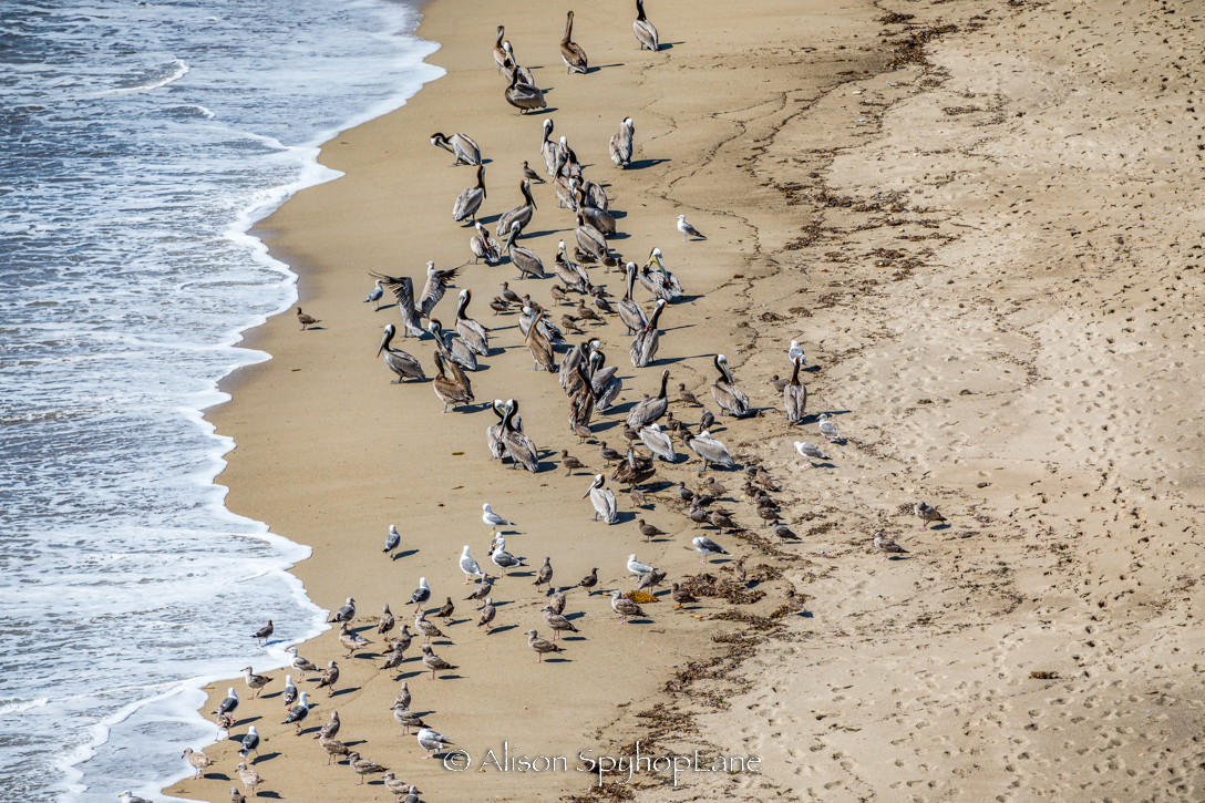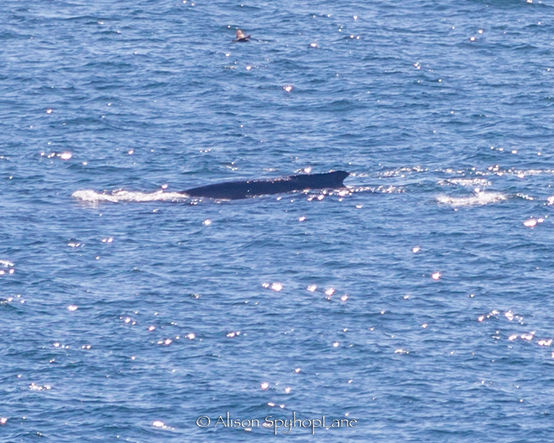 Busy day with three different species of Cetacea Mysticeti also known as baleen whales, including, one fin whale, nine gray whales and a pair of humpback whales. The fin whale was seen early in the morning half a mile or more off shore followed by a pair of humpback whales that came in as close as 300 yards off shore and remained nearby feeding until well after sunset while slowly moving north. Three of the gray whales were underweight, one was emaciated. Sea lions and dolphins were seen stampeding to and from the feeding frenzy areas, zig zagging across the transect several times throughout the day.