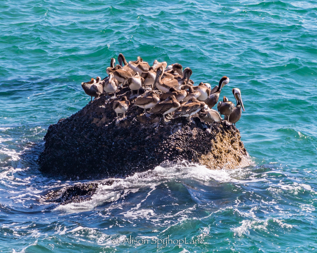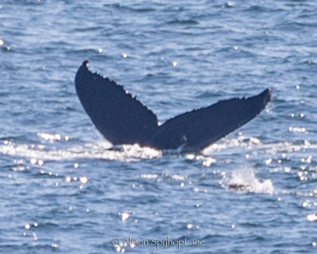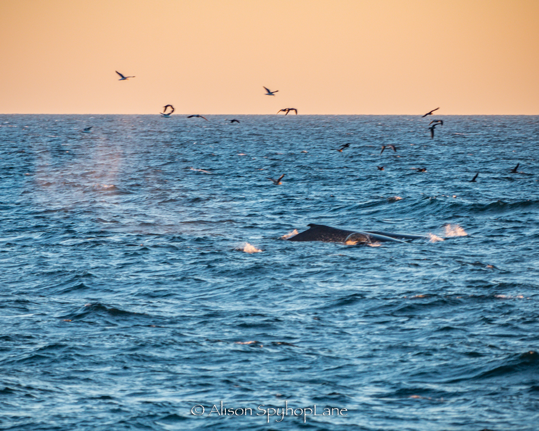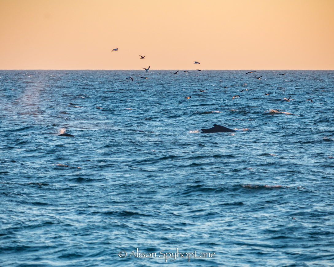 Humpback pair feeding near shore as close as 300 yards. Baleen whales have special throats that are pleated and expand while feeding, then as the whales gulp the fish filled water it is filtered out between the baleen and the fish that remain are swallowed. Humpbacks consume 3-5,000 lbs of small fish or krill per day! Sea-lions and dolphins took turns in the feeding frenzy on and off throughout the day.