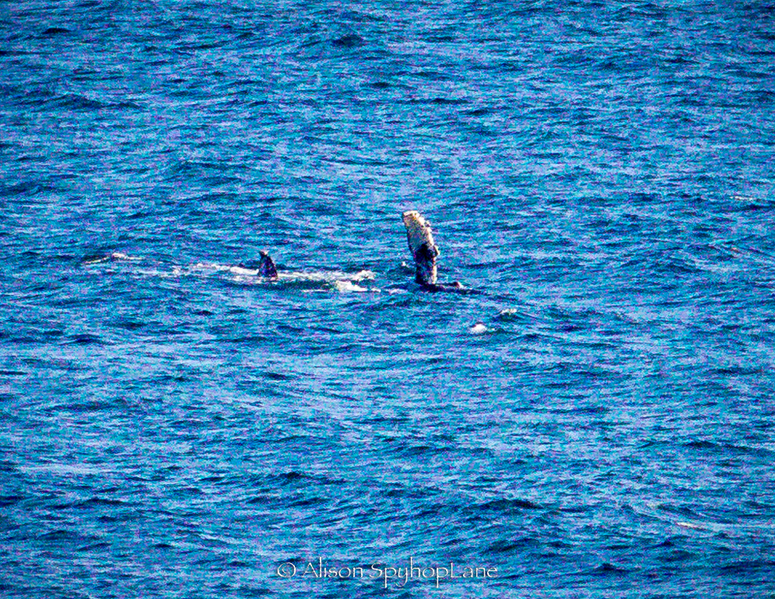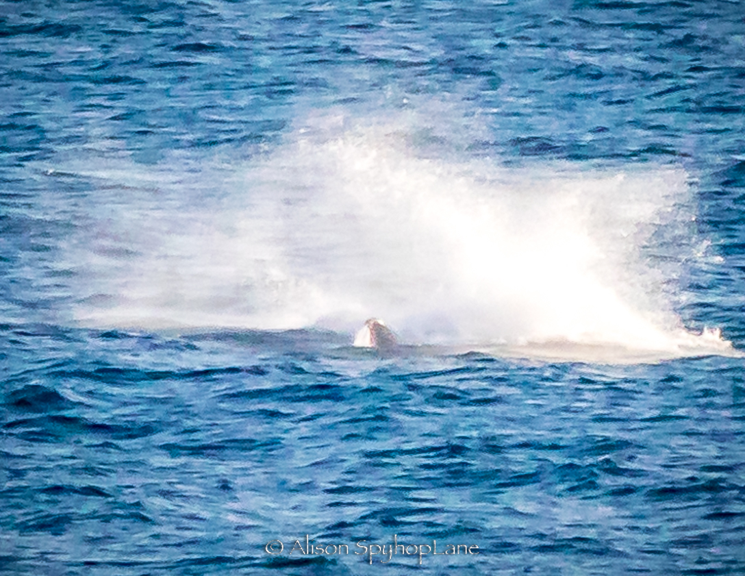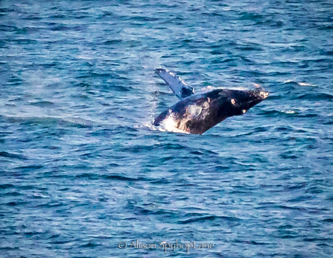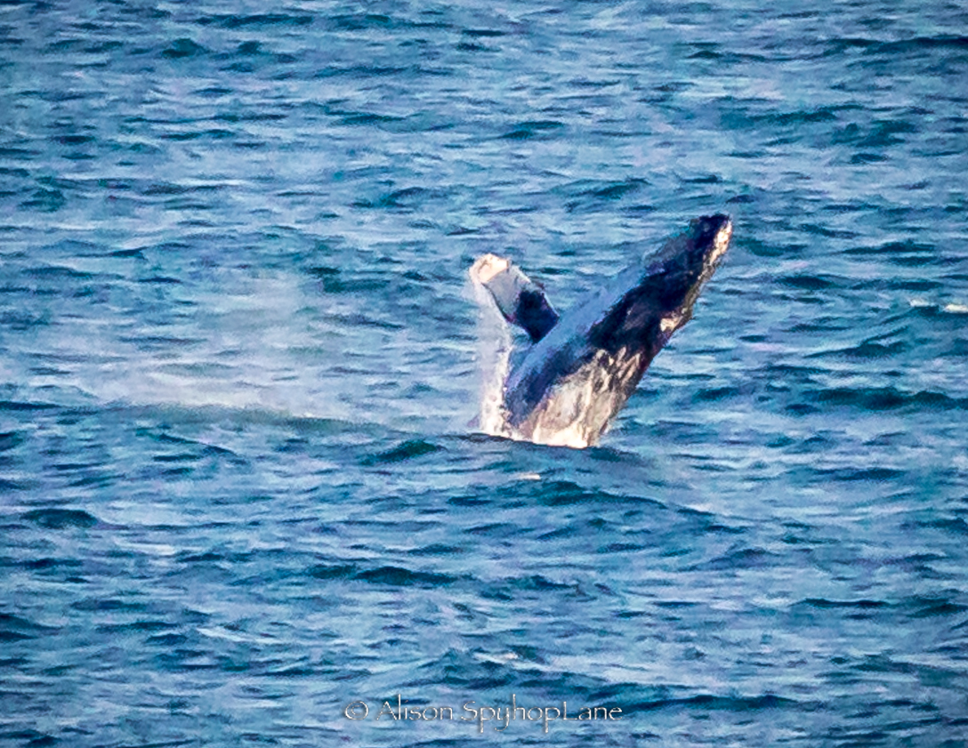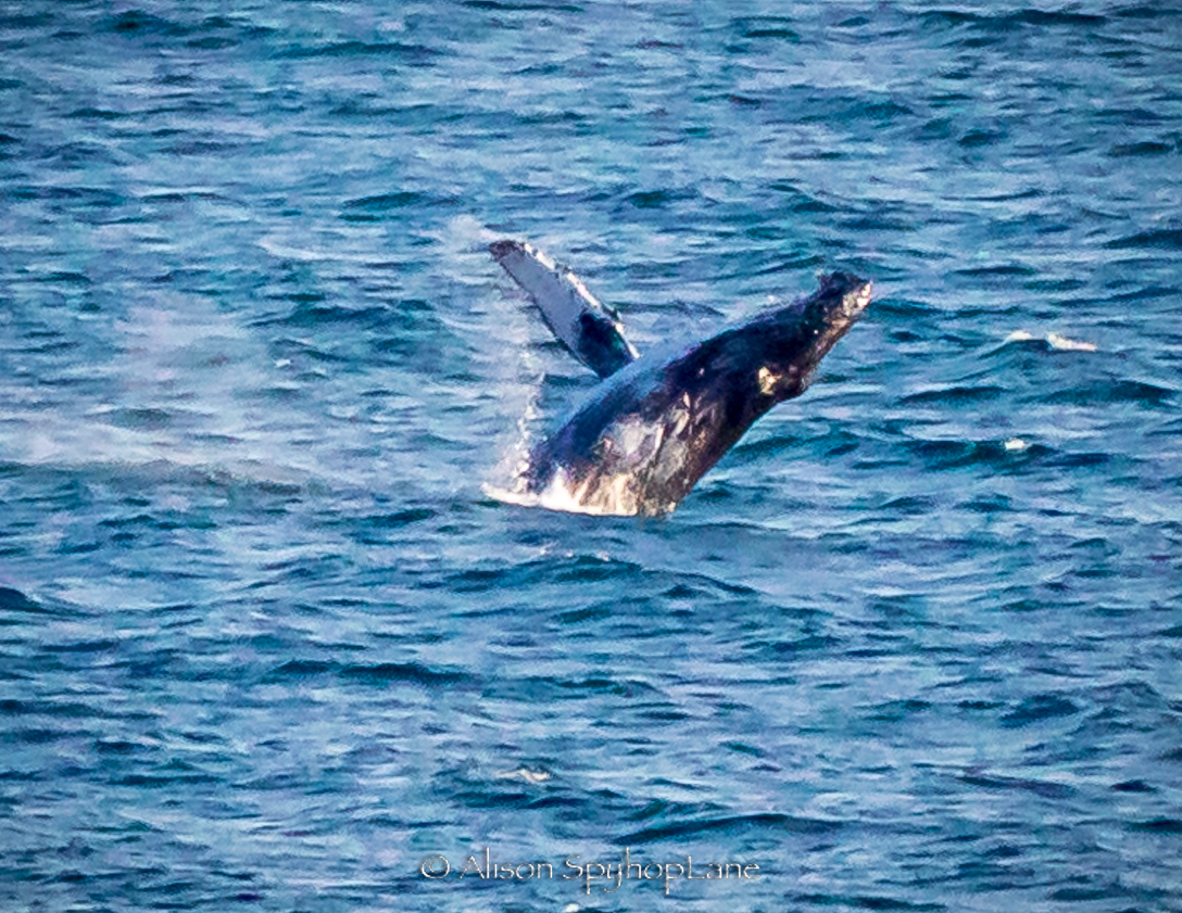 A big Thank You to LA County Lifeguard Carter Baldwin for spotting what turned out to be a humpback whale migrating past Point Dume today! This humpback traveled through, much the way the gray whales migrate near shore, coming in close, passing the point and then heading out to deeper waters at 500 yards off shore. I was able to relocate the whale just north of Nicholas Canyon Beach, first appearing like a pod of dolphins leaping and porpoising just outside the kelp line moving very quickly splashing with flashes of dark bodies, only to realize it was the whale when it breached out of the water! This behavior continued for just over an hour, and had reportedly been breaching for a good 30 minutes prior to my sighting. Wow! Each breach requires and enormous amount of energy and a speed of up to 28 kph. The humpback whale breached every 30-90 seconds as it slowly traveled north (west). 42 total breaches, alternating with at least 8 episodes of pectoral flipper slapping sessions lasting up to 90 seconds each and at least 9 incidents of fluking. The whale finally slowed down as it was nearing county line and then that was it…it migrated on low profile, leaving footprints a mile or more away.