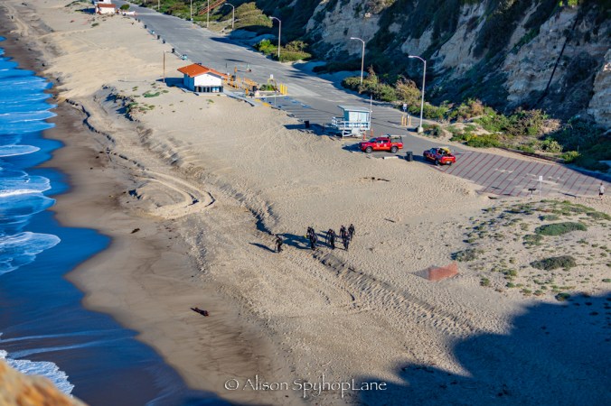 Clear skies, sunny 60 degrees, no wind, calm flat ocean with views across the Santa Monica Bay. So clear words can be read on the cargo ships and the topography can be seen at the Channel Islands. The road remains closed to drive into Point Dume State Beach as construction and repairs from the last storm and high tides can be fully repaired. Road is open to pedestrians.