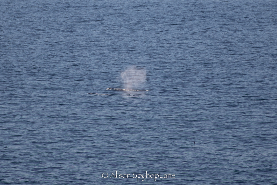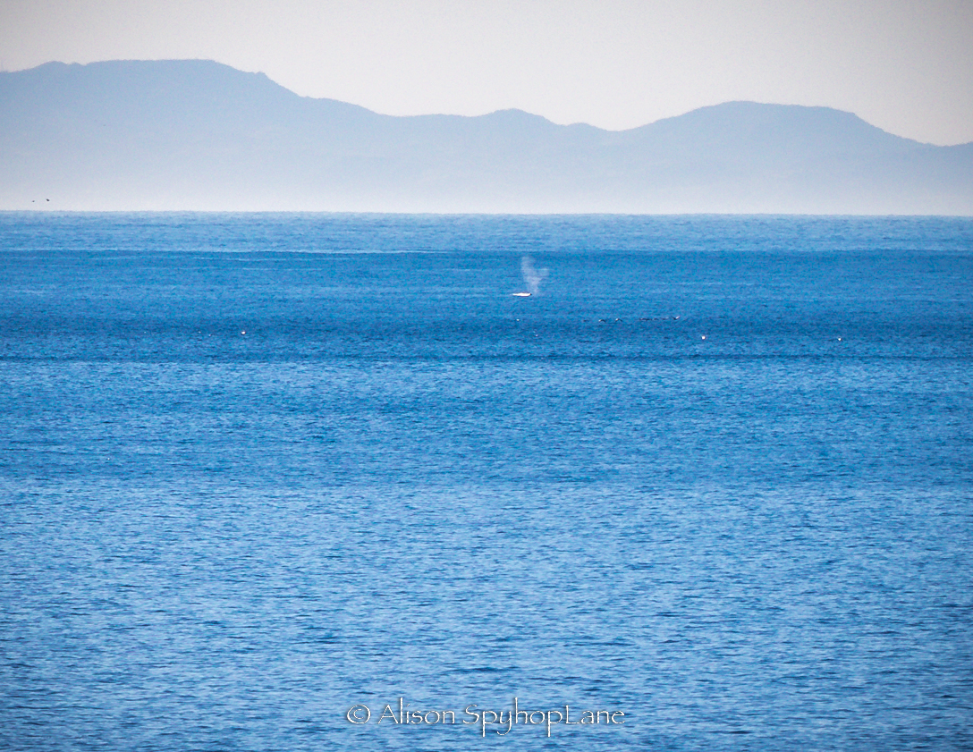 Two south bound gray whales came close to shore and passed through in stealth mode, barely skimming the surface to blow and continue on leaving two long fluke print trails side by side. Two unidentified whales seen 10+ miles away towards Catalina Island. Tall blows and body catching the light. No identification could be made at that distance. Sea Lions out rafting in two large groups of 10+ in each and a third, more active group was headed in to shore.