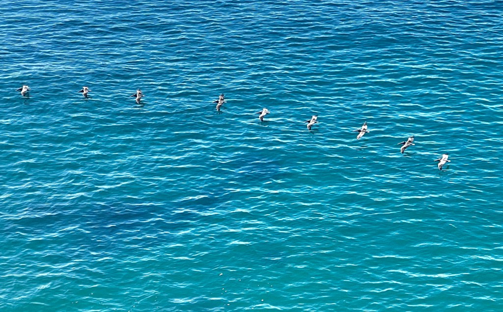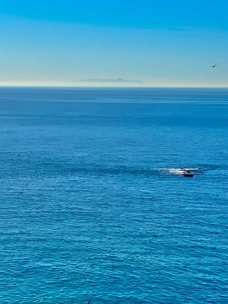Sunny, blue skies 67 degrees, calm flat ocean with 0-3 mph winds. Entire horizon covered in yellow smog, blocking Santa Barbara Island and diminished views of Catalina. No Gray Whales seen despite perfect conditions. Dozens of Pelicans in squadrons flying north and back south over and over at different altitudes. 150 common dolphins stampeded north one mile out. No updates on parking lot opening.