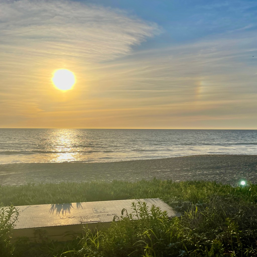 No gray whales observed in calm clear viewing conditions. The road crew finished what is hopefully the last repair and the parking lot will open this weekend. A gorgeous sunset that lit up in shades of red, orange, purple, pink, lavender thanks to the accumulation of clouds. There was a sun dog or sunset rainbow visible to the right of the sun, an atmospheric optical phenomenon due to the light rays refraction and water ice crystals in the clouds. Also known as a parhelion. It’s called a sun dog in reference to greek mythology-Zeus walked across the sun with two dogs and the rainbows appear one on each side representing his dogs as companions to the sun. Sun dogs are relatively rare occurrences. A sun pillar was partially visible, which is a beam of light refracted perpendicular to the sun shining straight up through the clouds.