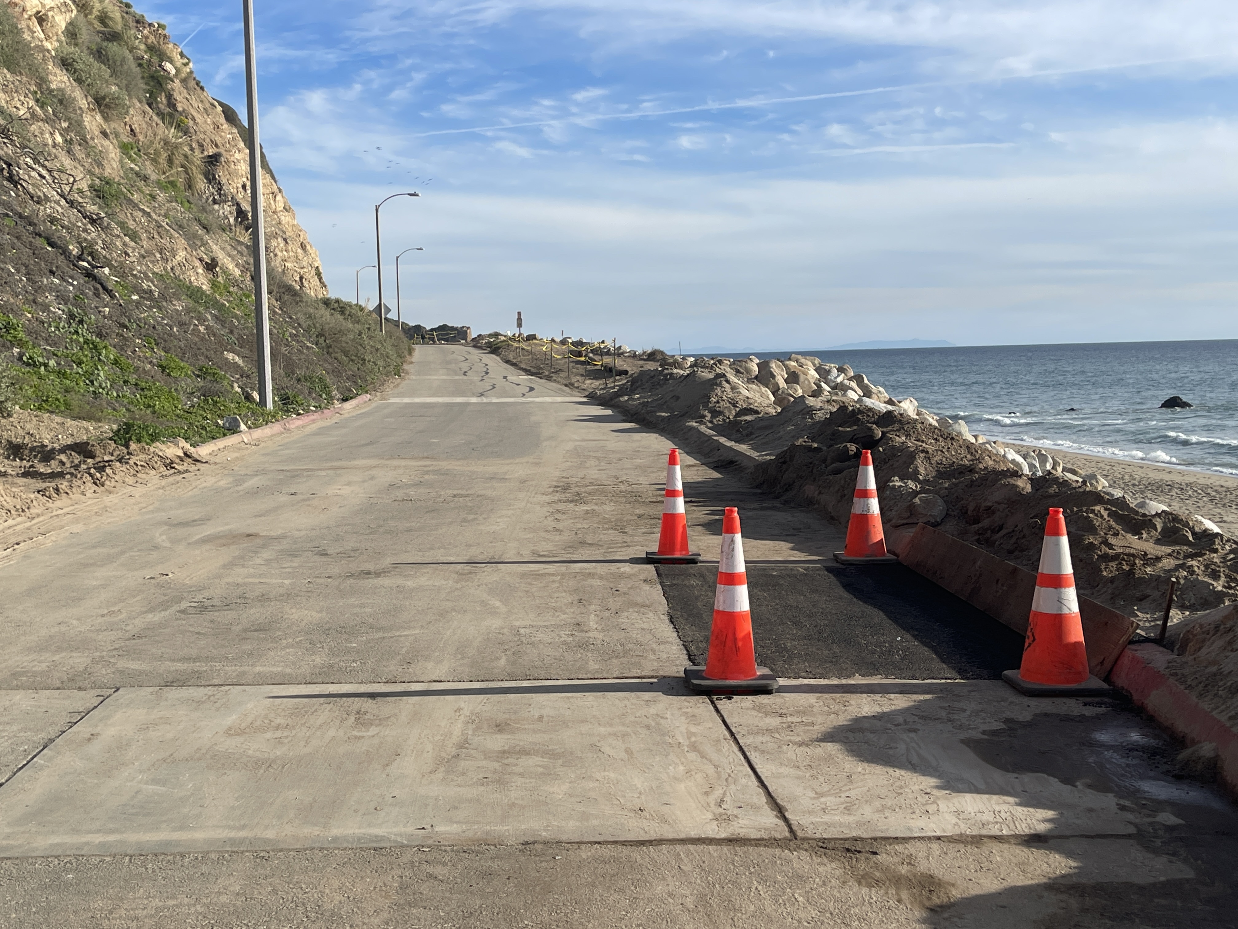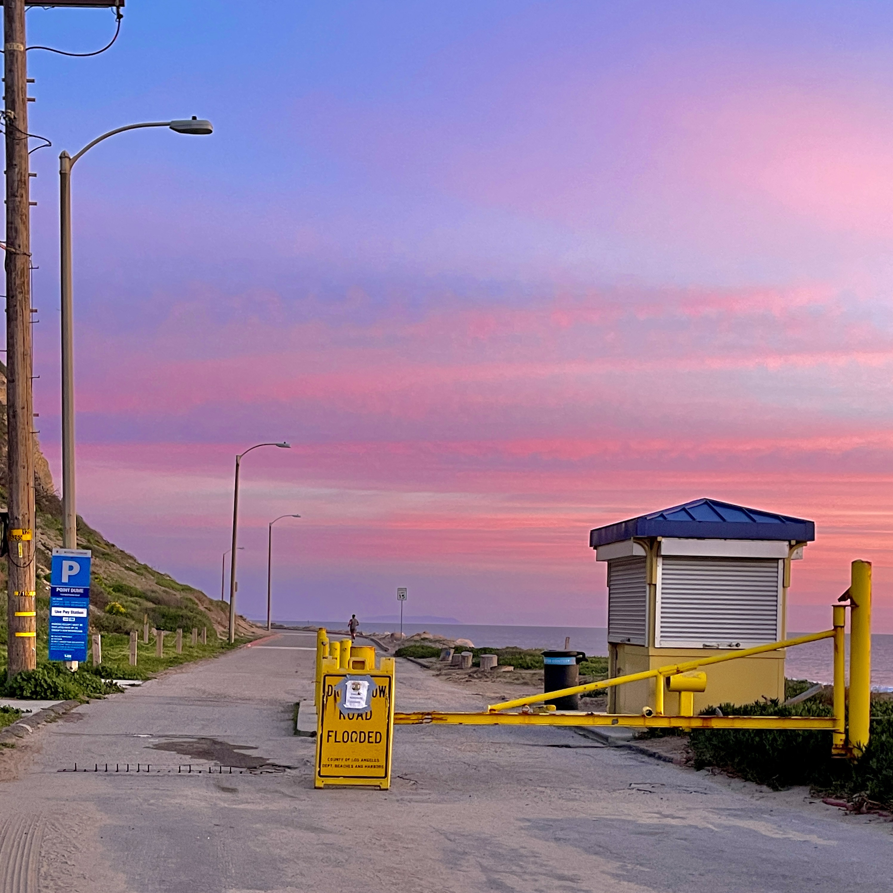 No gray whales observed in calm clear viewing conditions. The road crew finished what is hopefully the last repair and the parking lot will open this weekend. A gorgeous sunset that lit up in shades of red, orange, purple, pink, lavender thanks to the accumulation of clouds. There was a sun dog or sunset rainbow visible to the right of the sun, an atmospheric optical phenomenon due to the light rays refraction and water ice crystals in the clouds. Also known as a parhelion. It’s called a sun dog in reference to greek mythology-Zeus walked across the sun with two dogs and the rainbows appear one on each side representing his dogs as companions to the sun. Sun dogs are relatively rare occurrences. A sun pillar was partially visible, which is a beam of light refracted perpendicular to the sun shining straight up through the clouds.