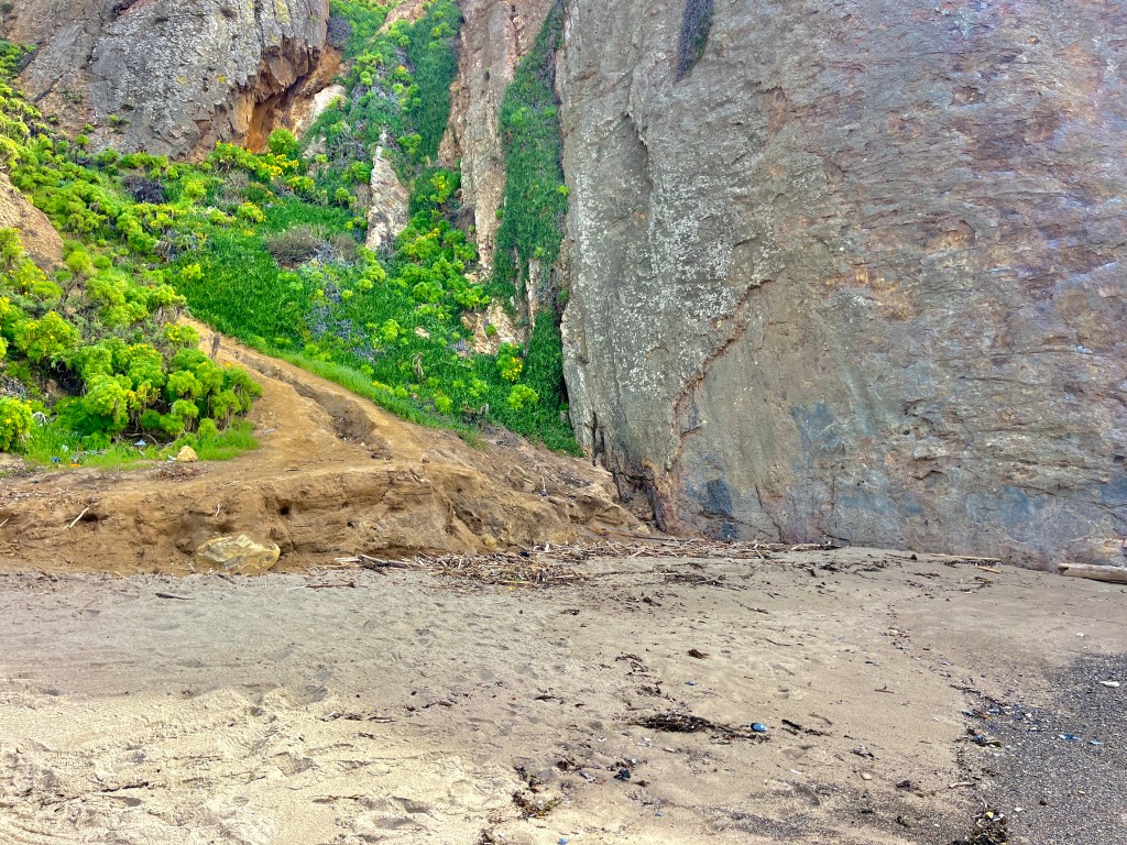 High winds yesterday and overnight left piles of sand accumulation in the parking lot. Massive erosion at the base of the rock climbing wall to the base of the bluff at a right angle. Sand from within the rocky edge of the cliff is eroded and exposing large boulders with mossy sea grass and intertidal mussel covered rocks.