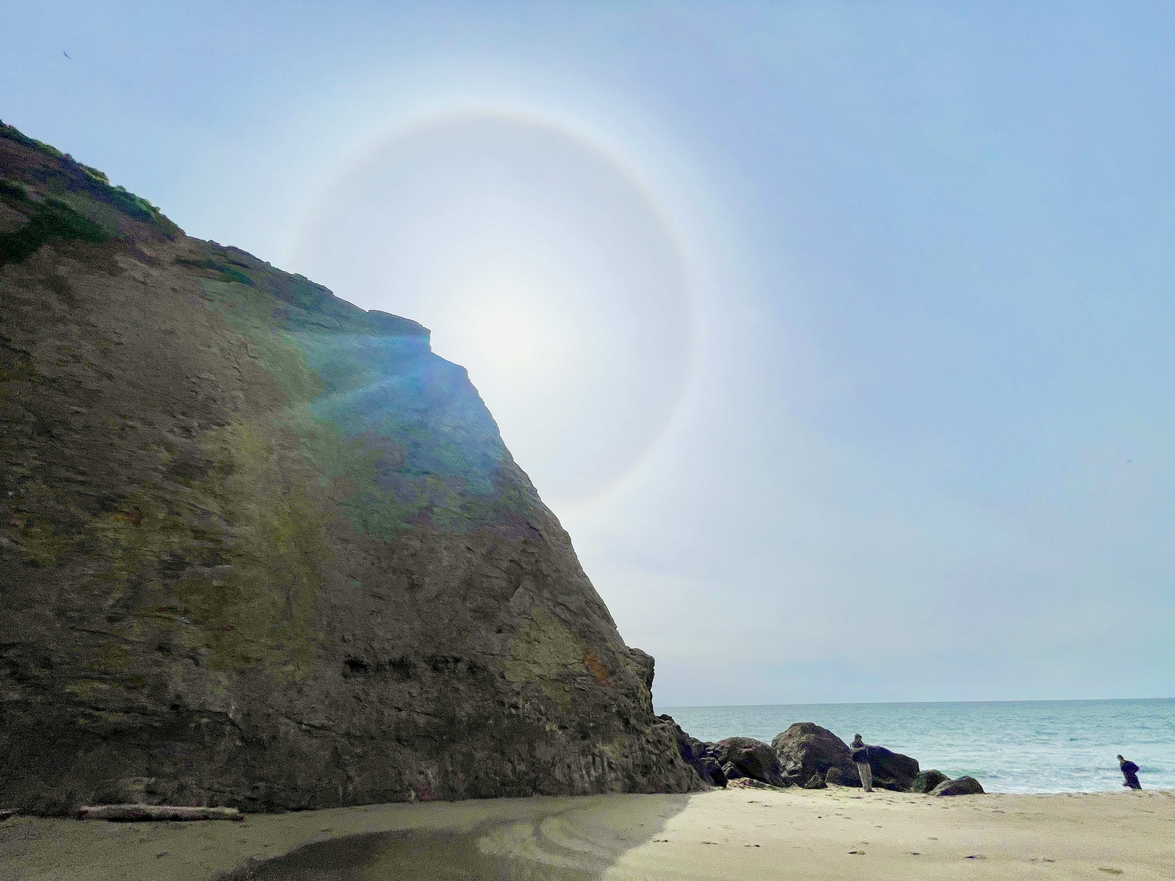 A sun halo was seen for an hour or so, which is an optical phenomenon caused by the sun refracting light through humid air, high in the atmosphere creating a prism rainbow in a complete circle around the sun.