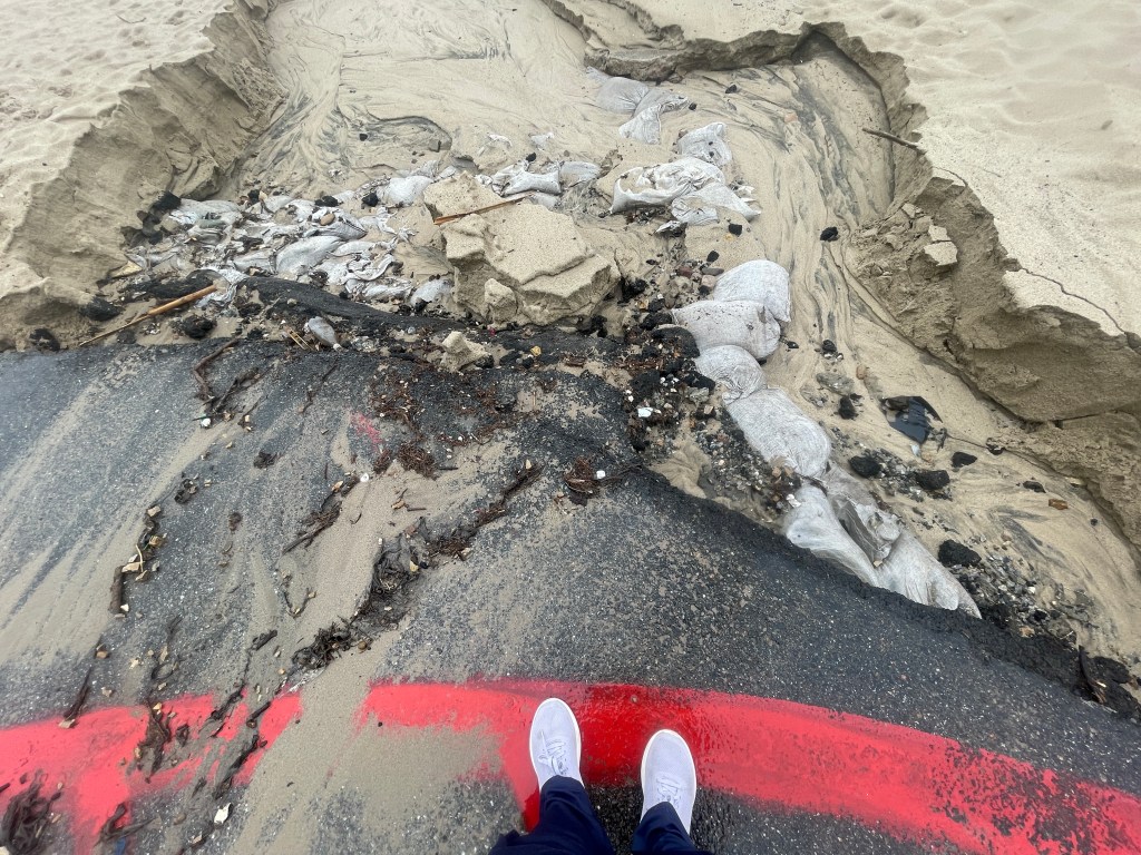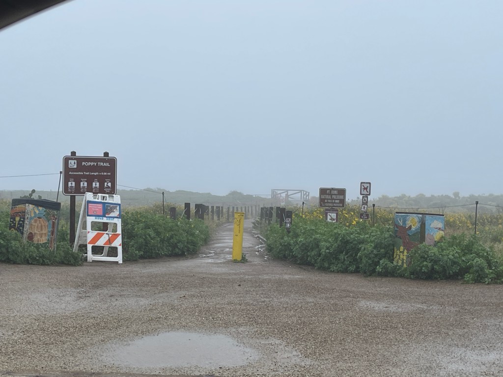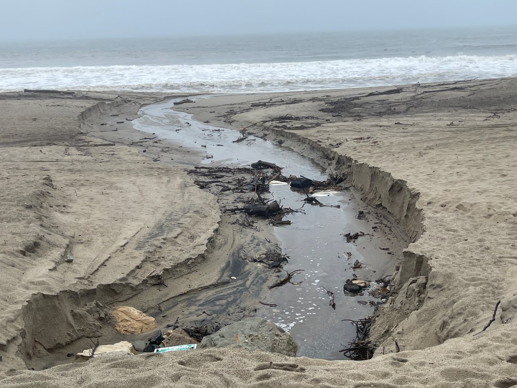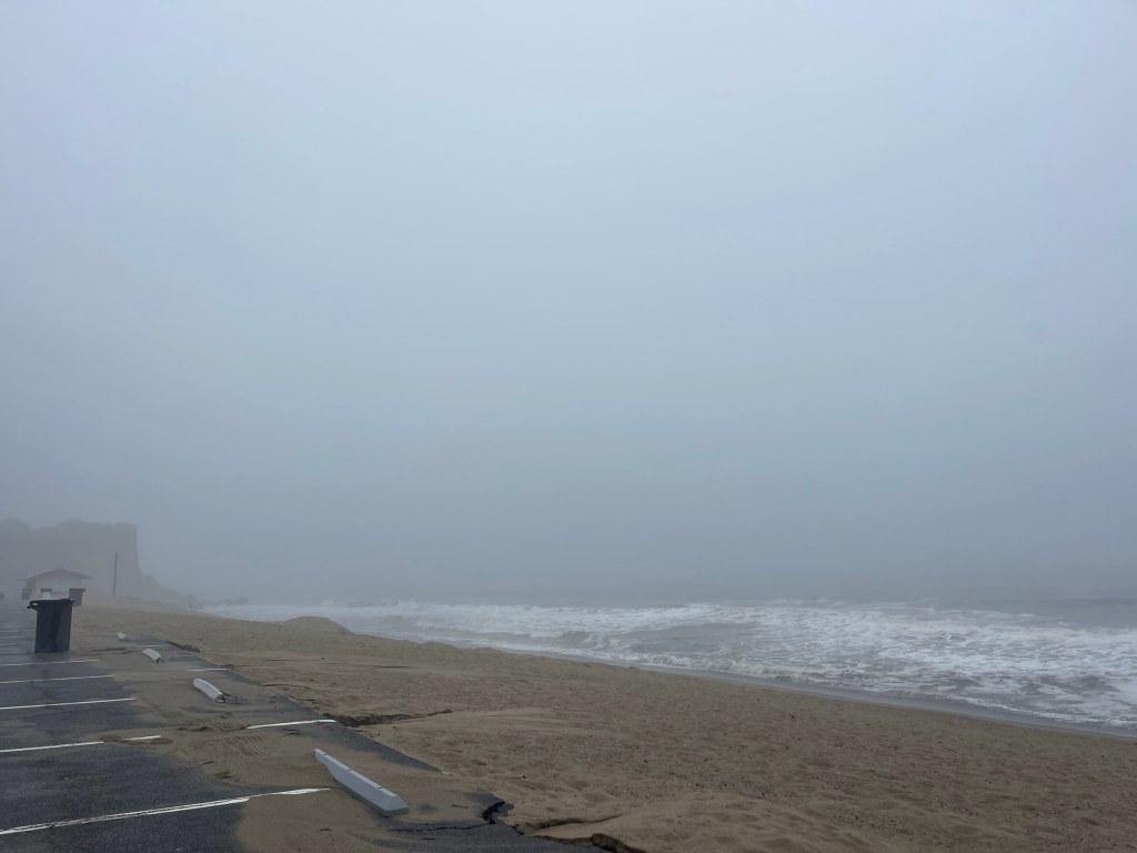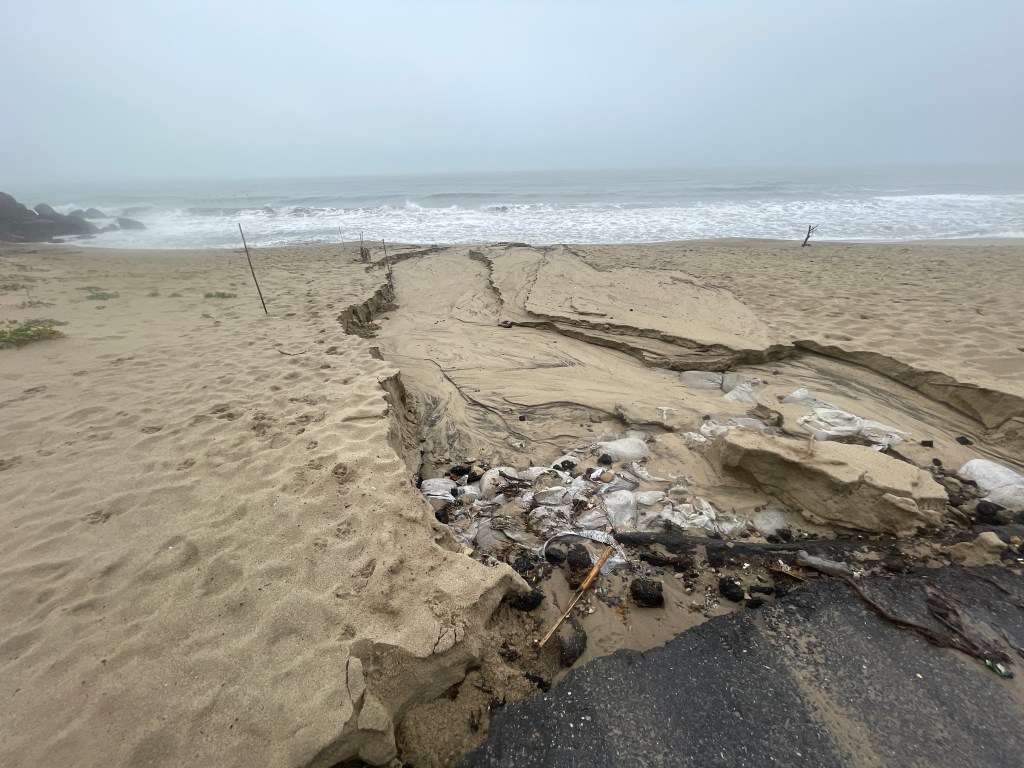 Light rain and drizzle with heavy marine layer, decreased visibility with low ceiling and white out conditions in the morning. 56 degrees, massive runoff erosion with fresh cut scarp near storm drains along Westward. Logs and debris scattered in tide line with 4-6 ft waves, sandy murky water with yellow brown seafoam. Late afternoon sun peeking though with rough choppy surf and gusty 12-15mph winds. Westward Road was closed at the PCH due to a downed telephone pole and electric power lines.