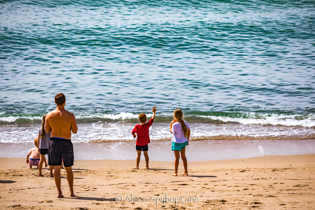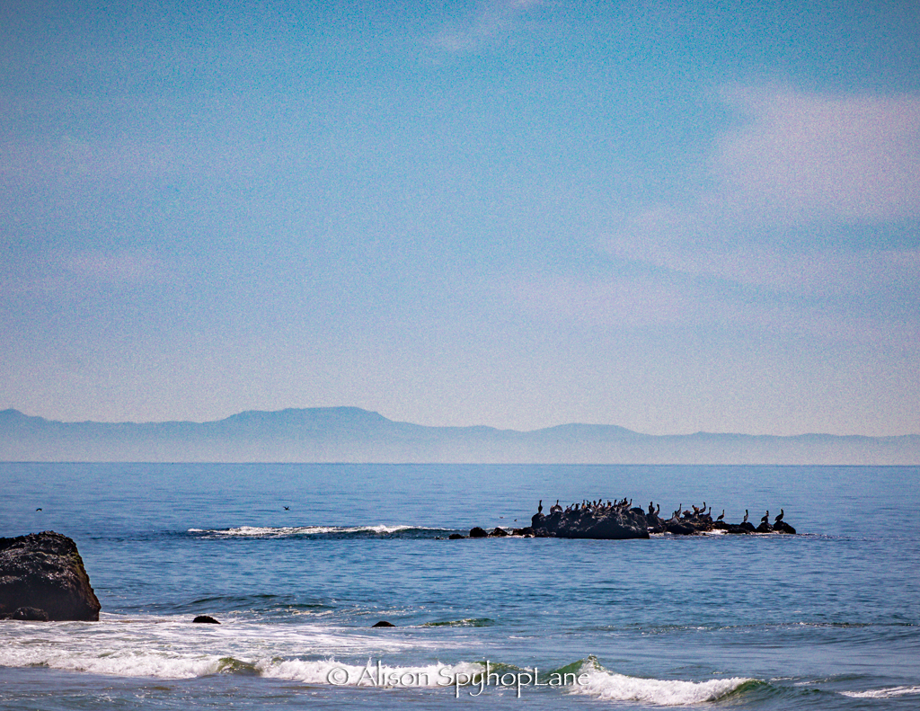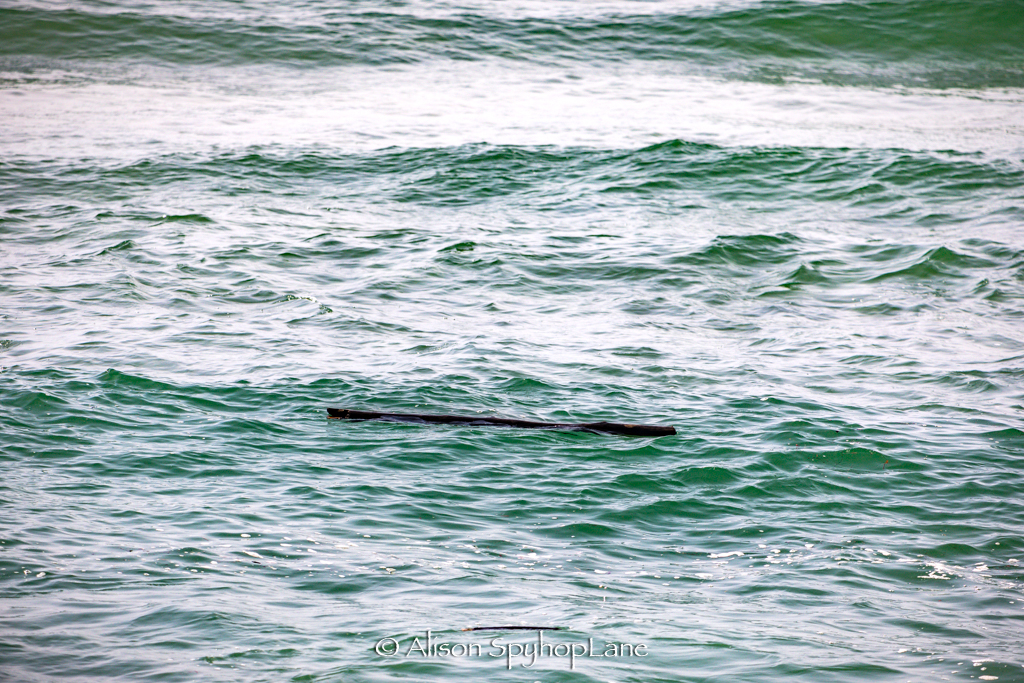 A calm flat ocean with zero to little wind. The sky matching the ocean in color and mood except for the yellow layer of smoggy haze at the horizon. Hazy outlines of the channel islands including Santa Barbara Island which we don’t always see. Large 10-15 ft logs and hundreds of bamboo sticks floated in the surf, more visible today with lack of wave action. The gray whales have many obstacles as they migrate including these huge logs. Gray whales do not use echolocation (biosonar) like dolphins, they rely on visual observations and auditory sounds to navigate the migration. The flat calm ocean today makes getting around these dangers a lot easier for the whales and the swimmers who braved the 55 degree cold water. Beach goers of all ages still enjoying the driftwood and bamboo sticks to create sculptures and or have pretend sword fights.