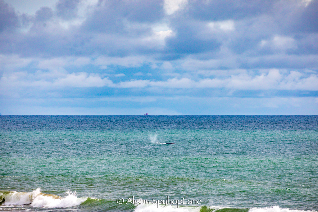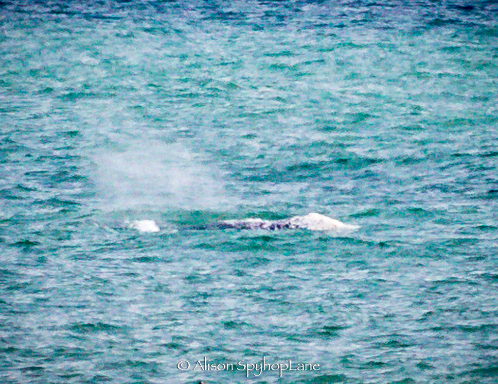 Cloudy overcast day with occasional light drizzle. Wind 1-3mph: 60 degrees. Interesting cloud formations throughout the day as another storm system makes it way to to our area. One of the gray whales observed today had a white rostrum covered in barnacles and the other gray whale had many clusters of orange whale lice. The pair traveled through quickly together and were not sighted past the transect.
