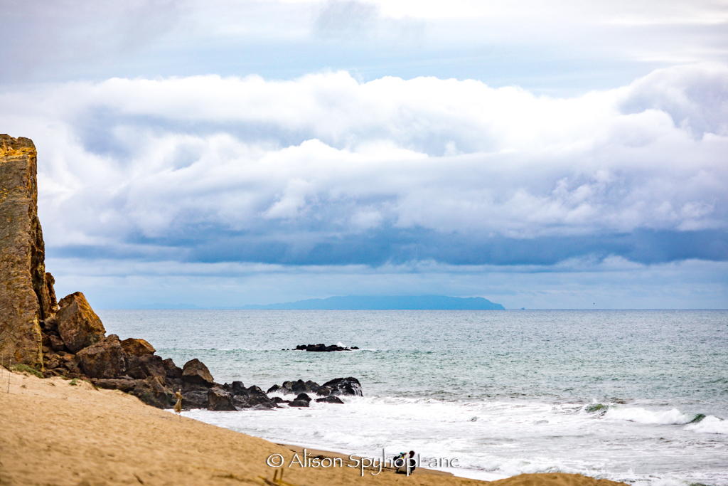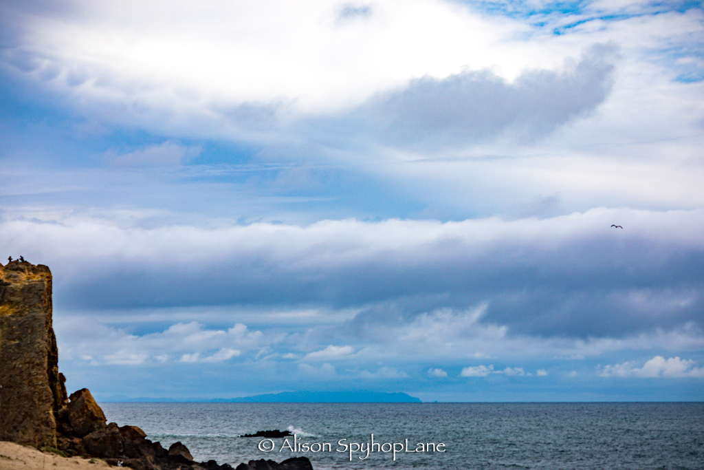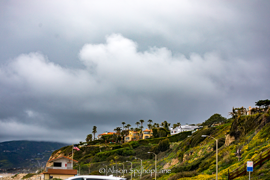 Rain spouts seen to the south over the Santa Monica Bay and darker stormy clouds filled in the horizon to the north blocking the sunset leaving a hint of pink light to highlight the Channel Islands.