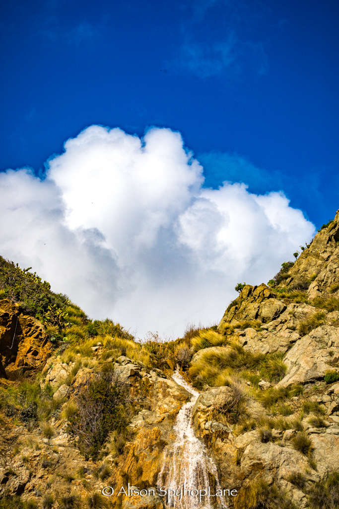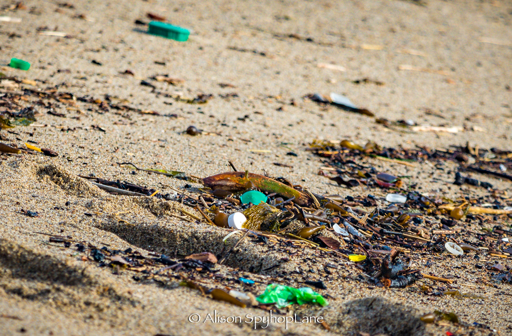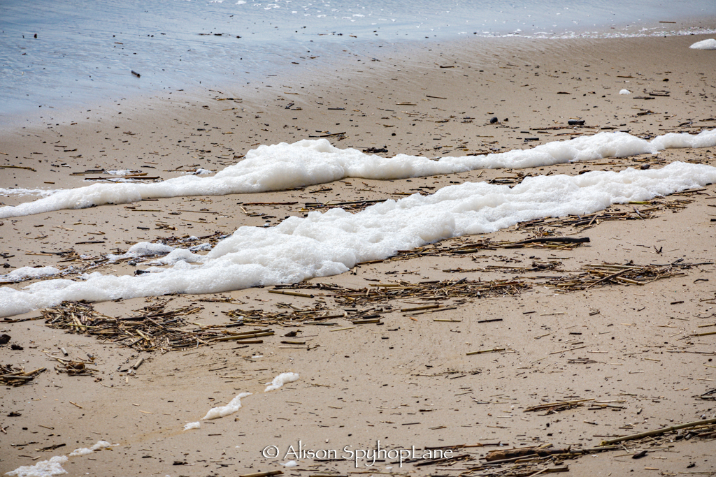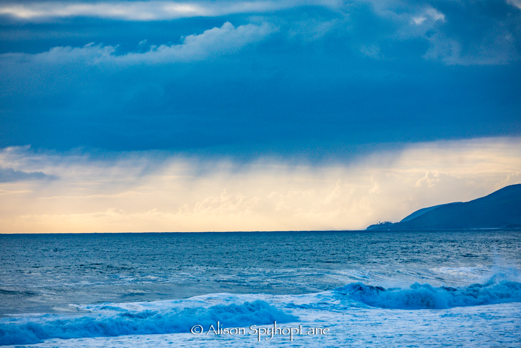 Rain all night and morning leading to drizzly afternoon with continued showers inland and high risk alerts for rock and mud slides. Care is required driving along canyon roads leading to the beaches and rain saturated areas. Rough choppy seas and muddy surf with accumulations of sea foam onshore at the tide line. Beaches littered with driftwood, large logs and plastic debris. High surf 6-8ft with gusty strong winds. The gray whales migrated though at top speed without stopping along the transect from the surf line to the hazy horizon in rough choppy surf. A seasonal waterfall is running along the PCH ( Pacific Coast Highway) and funneled below the highway, out to the ocean where advisories are in effect to not swim after rain due to high levels of bacteria risks. Bathhouse 3 (last one) is closed due to septic tank issues.