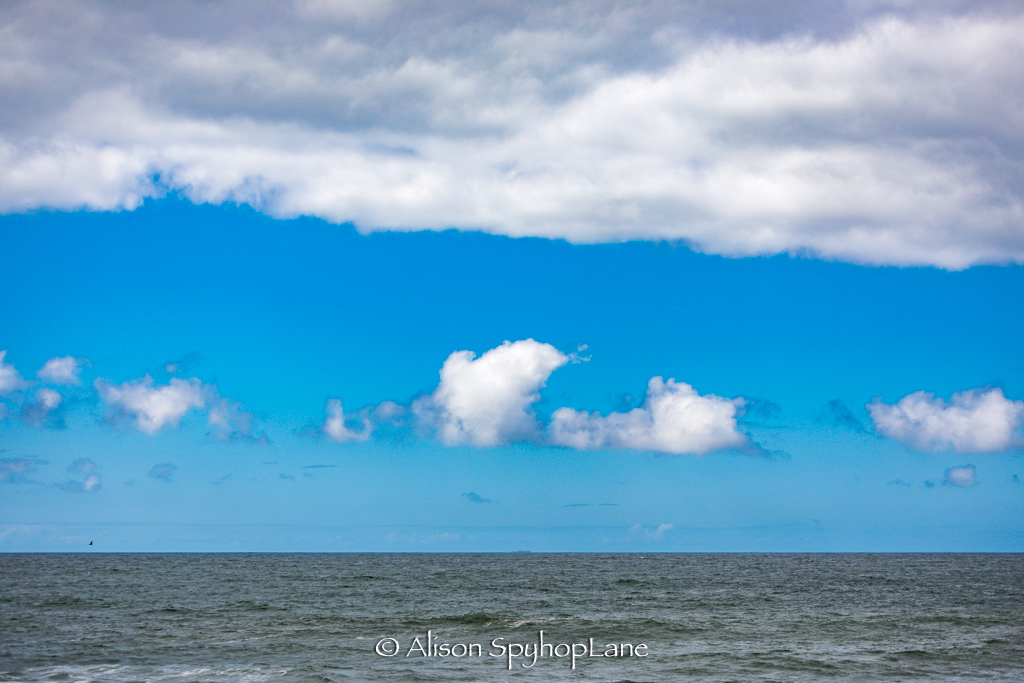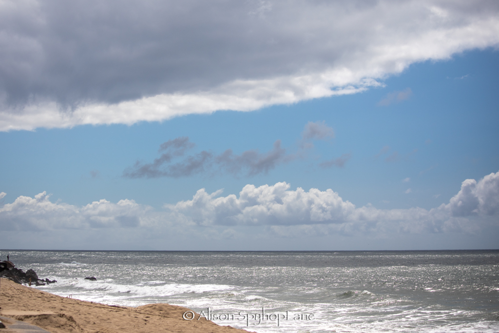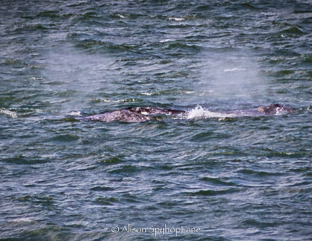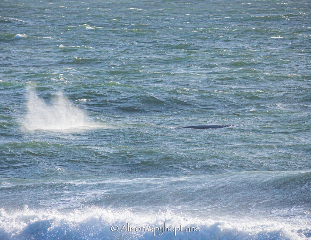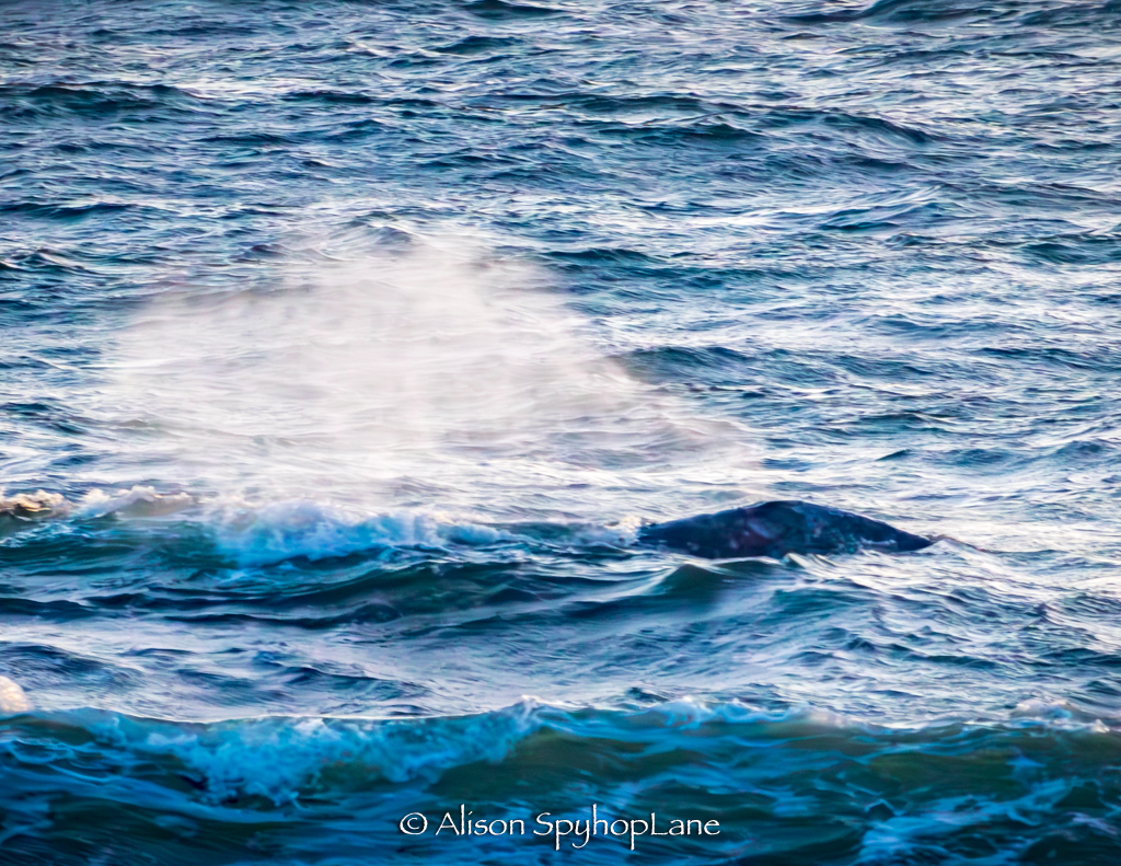 Sunny, blue skies and fluffy heart shaped cumulus clouds changed as a heavy storm system passed over head. 57 degrees. Rough choppy surf with large swells: wind 12-15mph makes spotting the whales difficult but thankfully some do come in very close for those beach goers who brave the strong 25+mph wind gusts blowing sand, making walking difficult at times.