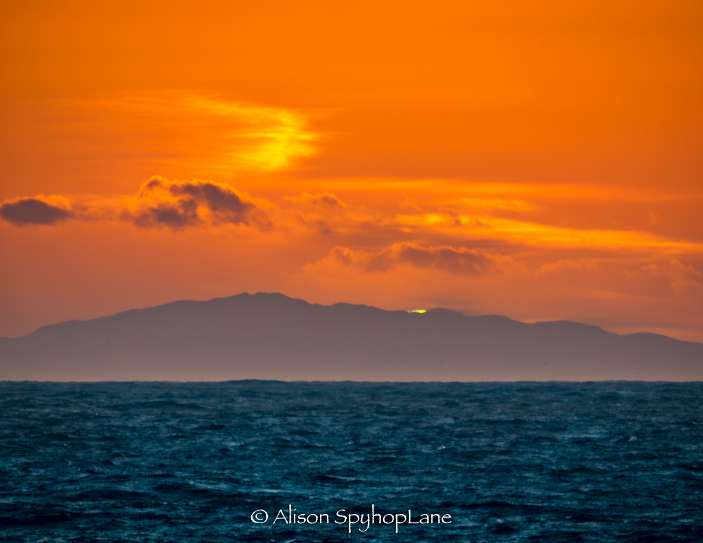 The sun set behind the Channel Islands with a split second, bright green flash. The last whale lingered in the surf slowly making its way north, spyhopping several times with lots of small direction changes in and out of the surf, rolling and back floating.