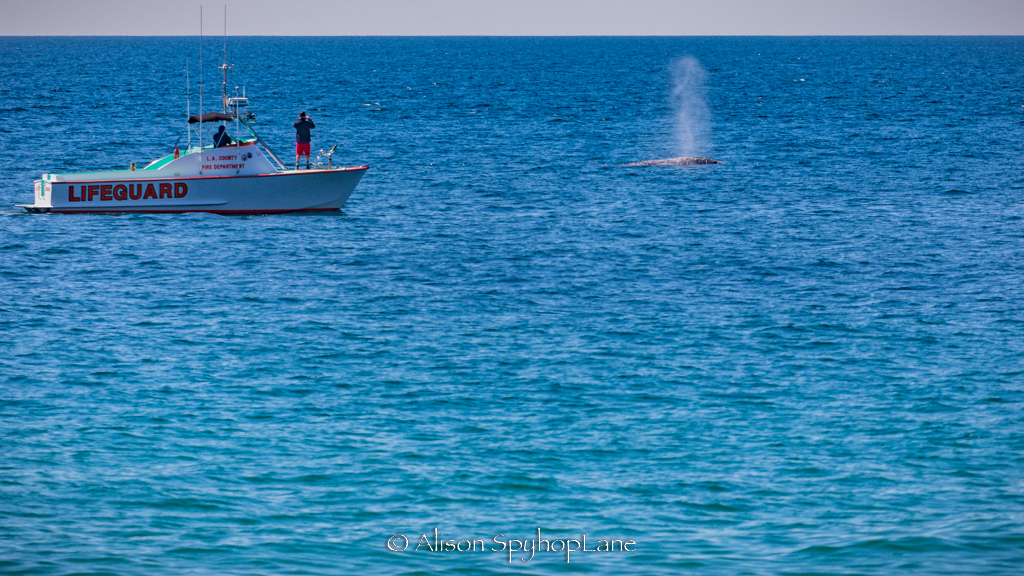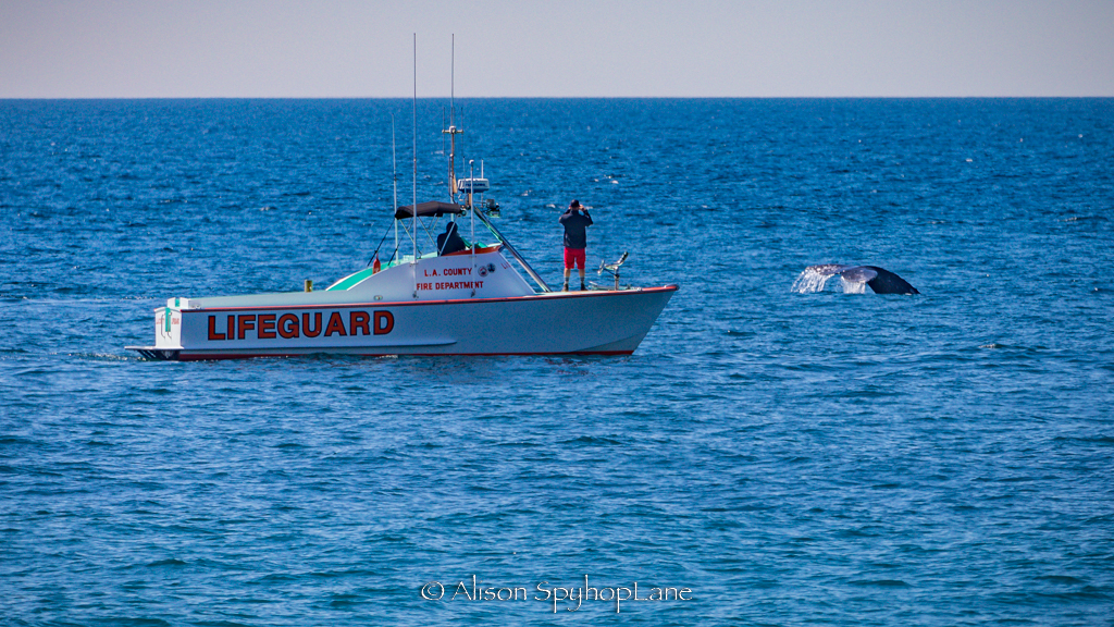 The next sighting was a trio slowing down the Baywatch LA boat which kept at least 100 yards behind as required by law, stopping and slowing down with the whales. Two of the trio were large adults fluked and continued on at a faster pace. The third whale turned back to the boat and the Caption promptly stopped the engine. The whale got closer but changed directions again and left on the same path, fluking as it went and eventually caught up to the faster pair.
