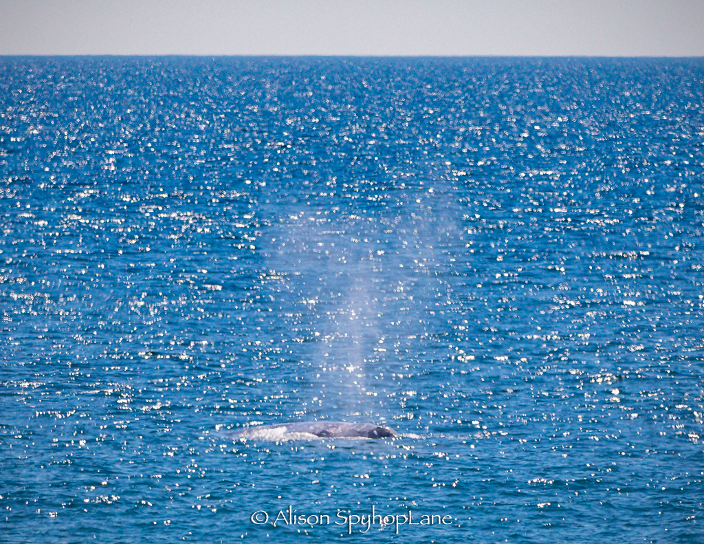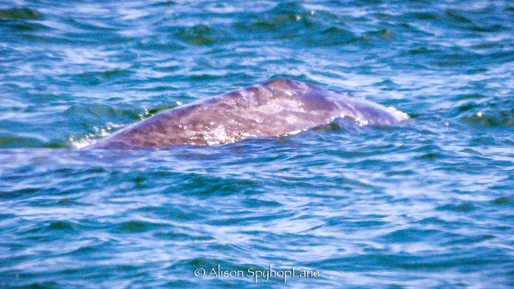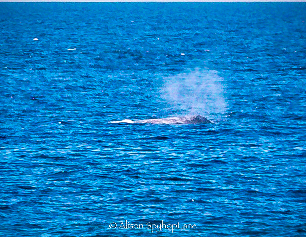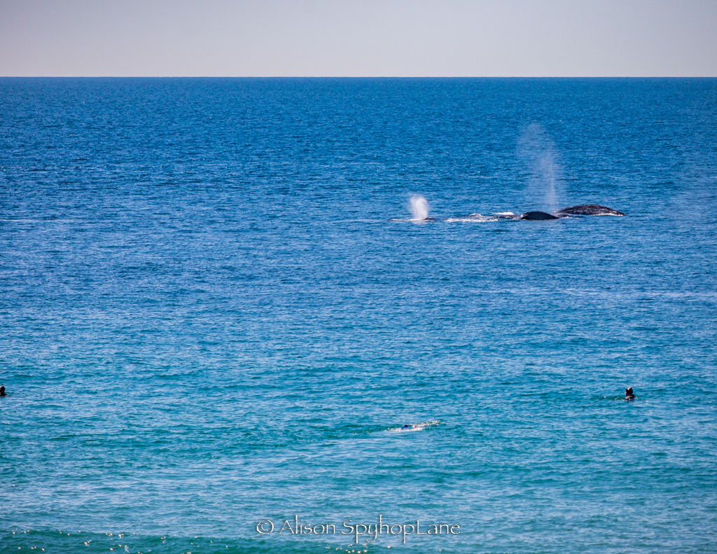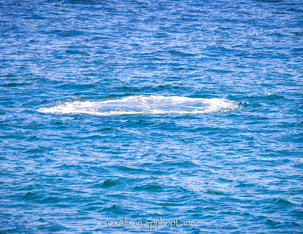 Other sightings involved two underweight whales, and one whale with what looks like older propeller scars along the dorsal hump area. One of the underweight whales changed directions in the surf line several times, exhaling underwater making bubble blast rings that dissipate on the surface to form white foamy ridge circular areas with flat water in the middle.