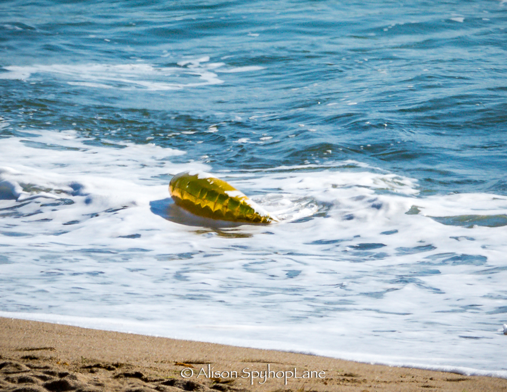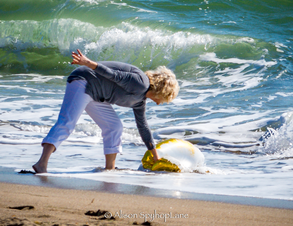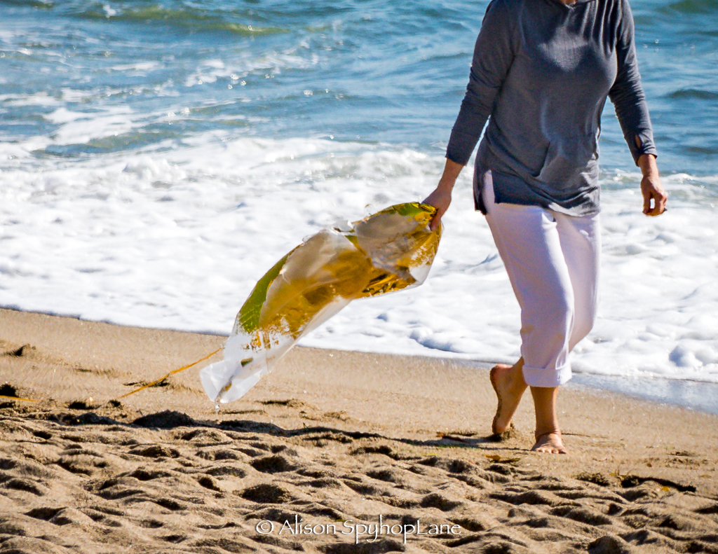 Mylar balloons drift in and out of the surf after its use at a celebratory event. These balloons travel on the wind easily and get pulled out into the open ocean on windy days. Today one washed in with the tide and a beach goer thoughtfully pulled it out of the water for proper disposal. Looking carefully at the balloon shows the gold metallic layer has worn away in the elements and these micro particles sink to the bottom where the gray whales and other marine life feed. Please avoid bringing mylar balloons to the beach to save wildlife habitat and dispose of them responsibly in the garbage.